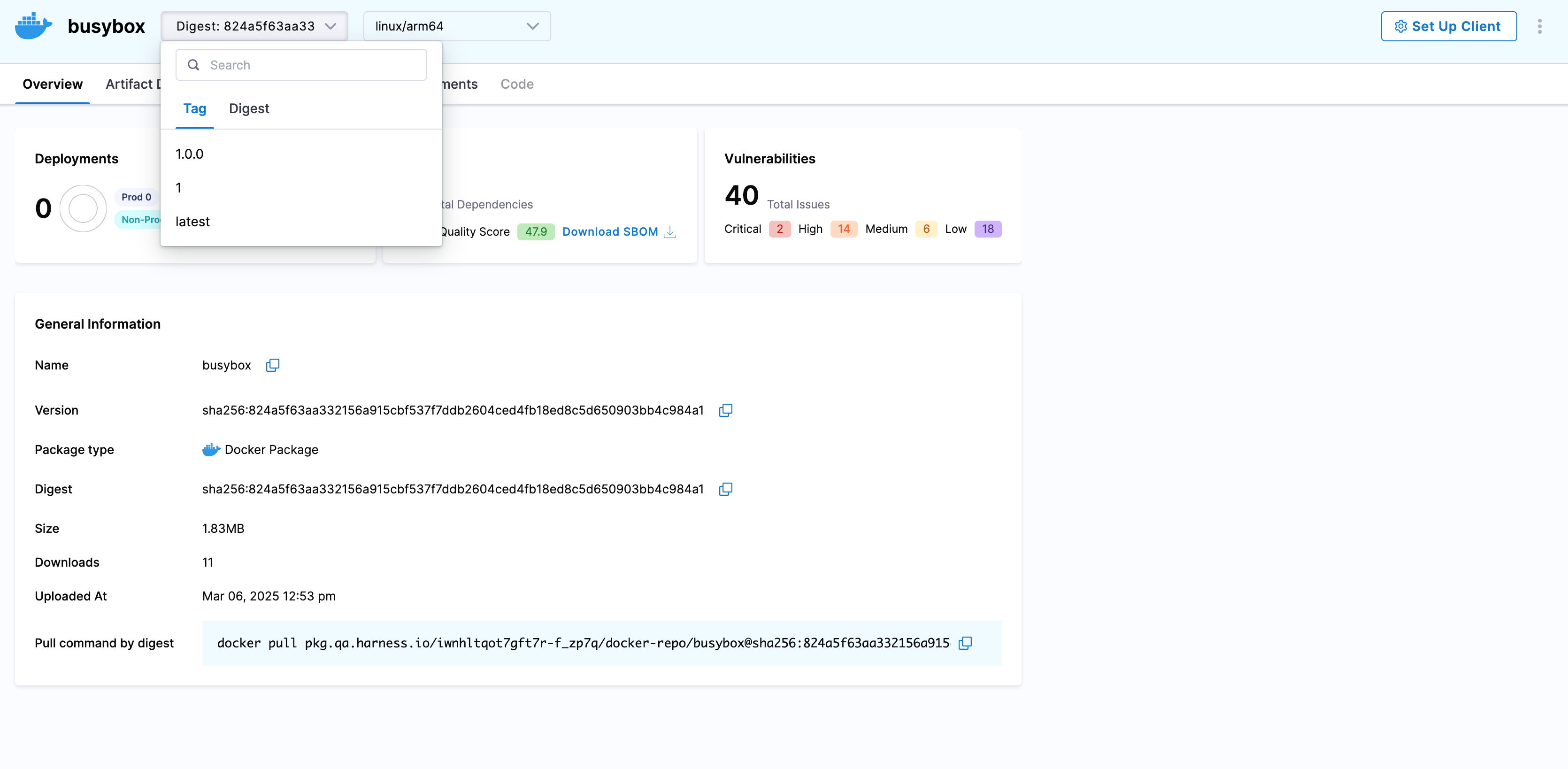 This section includes an overview of the artifact, offering a glimpse at all it's relevant information needed to manage it. Use this page to copy relevant information like the registry path or the pull command required to download the artifact.