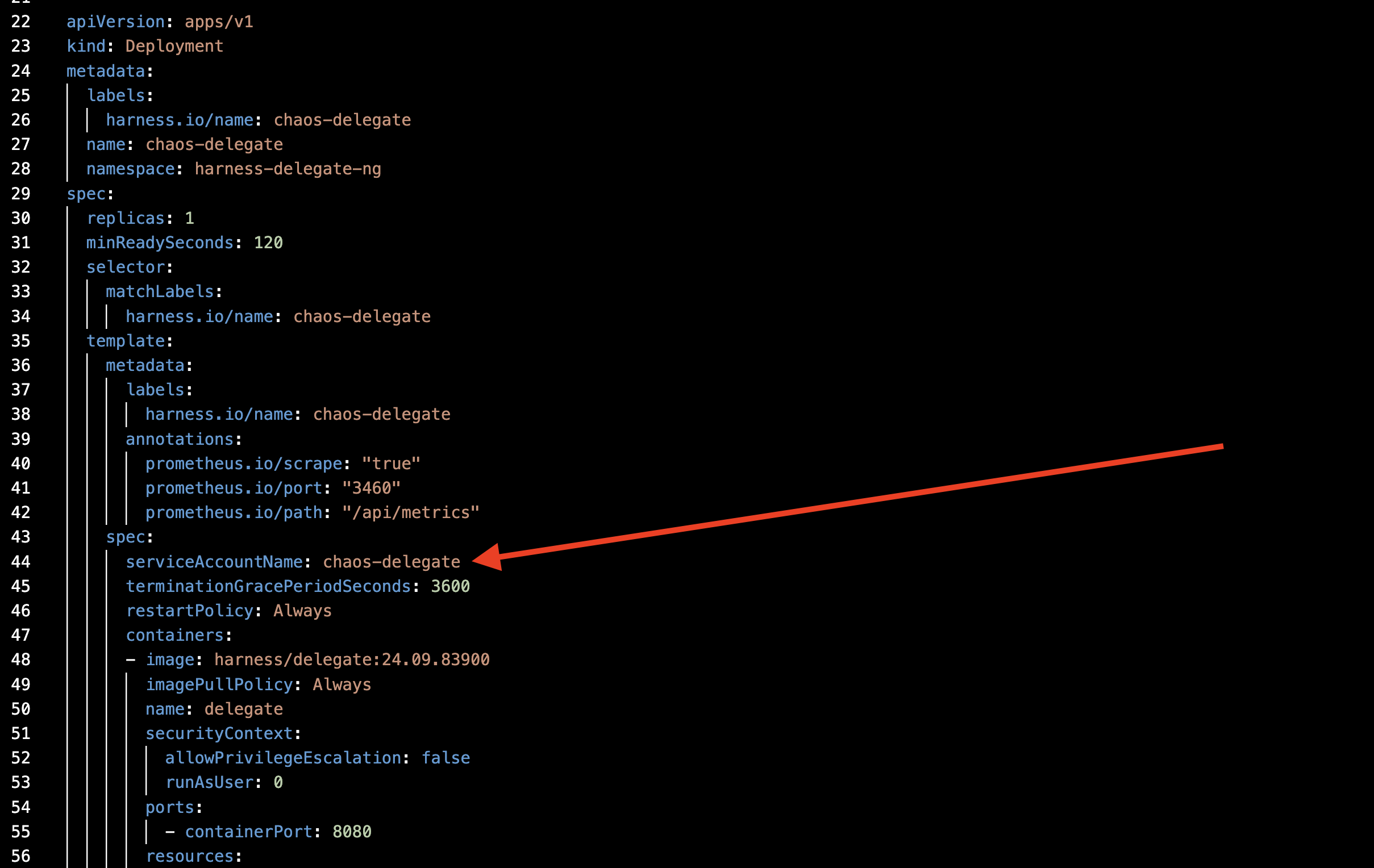 Attach the service account you created earlier to the Delegate YAML, as shown in the diagram.