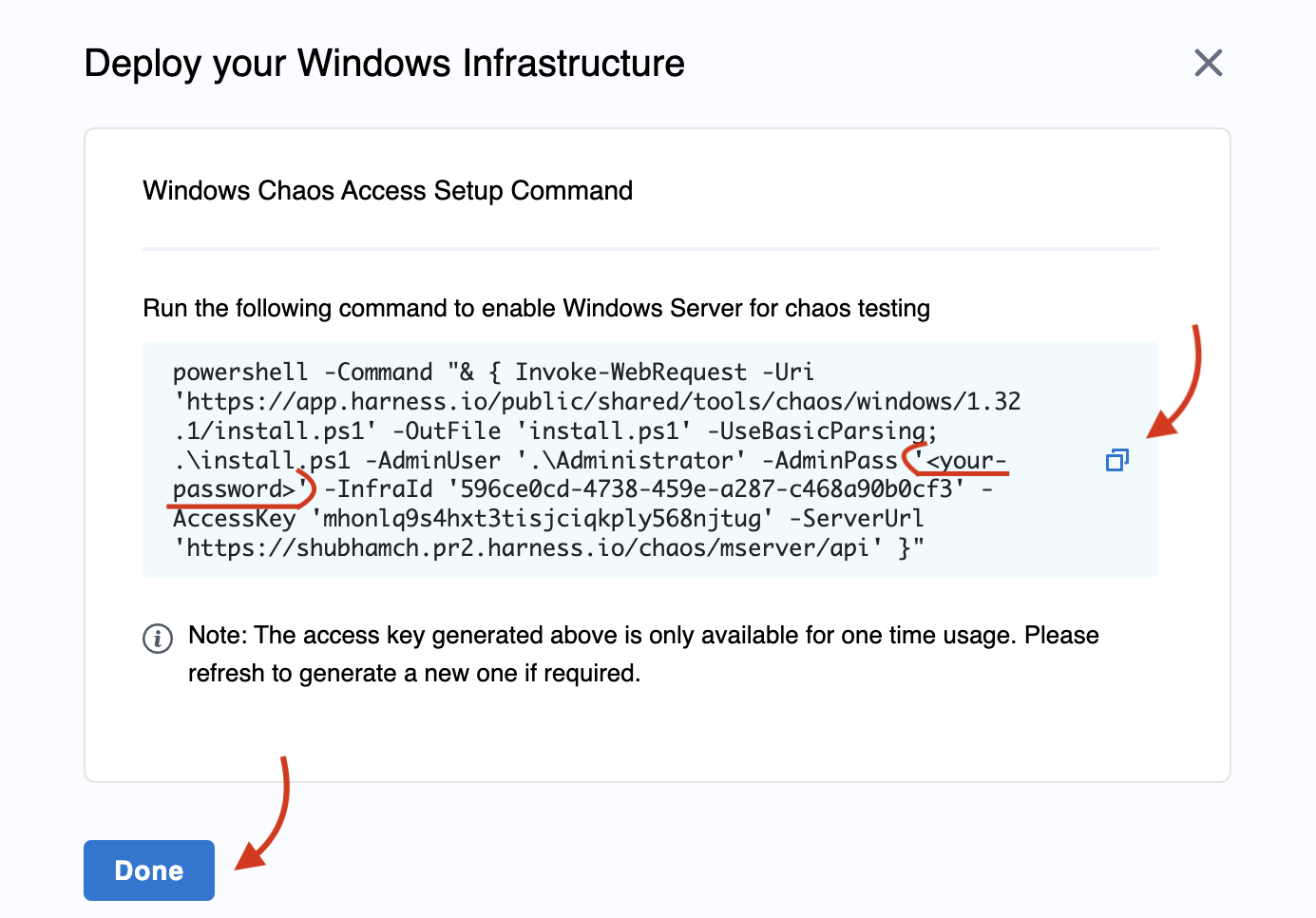 <your-password>placeholder. Execute this command on your terminal. Note: Administrator privileges are optional for installation, though some advanced chaos experiments may require administrator access. Click Done once you finish the execution.