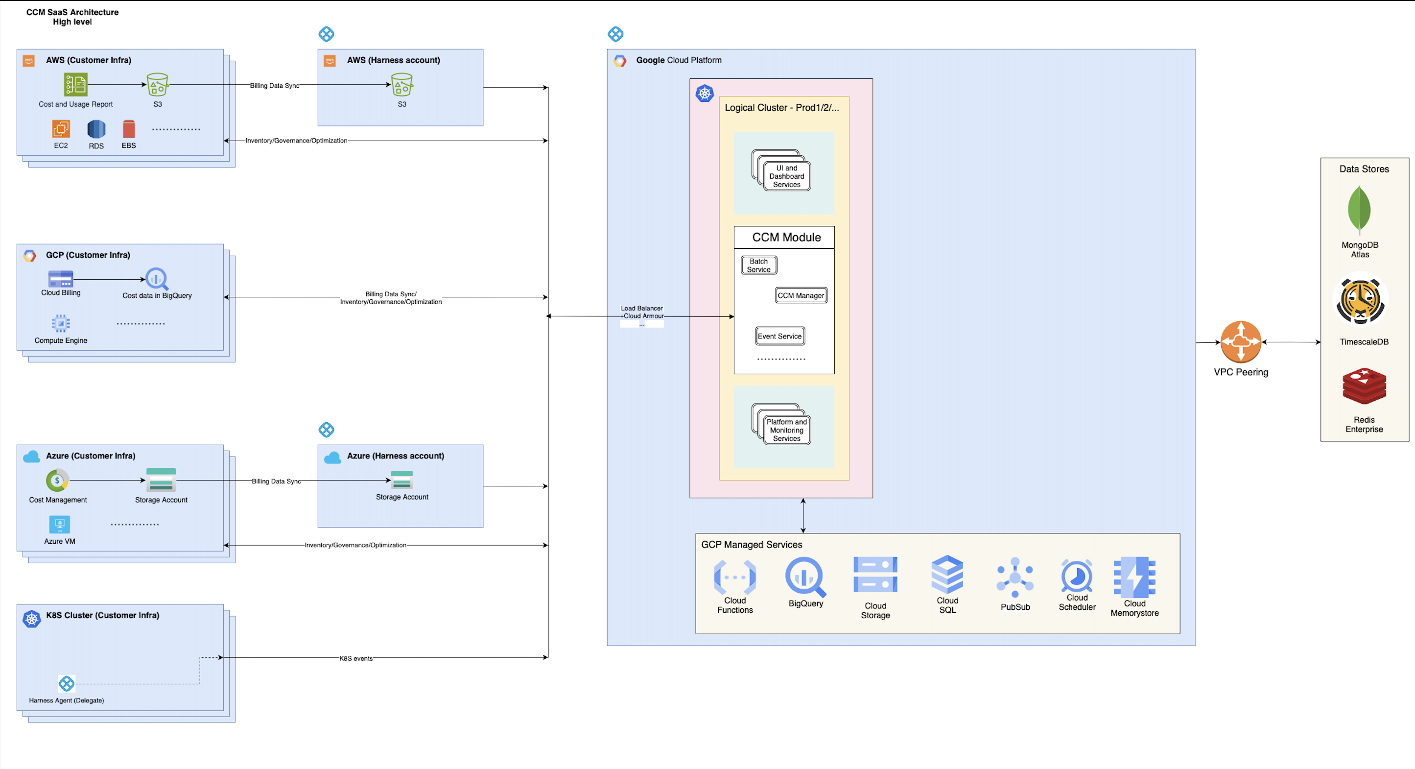 The primary datastore driving CCM's Cost Visibility features is BigQuery, with additional support from CloudSQL, CloudMemorystore, MongoDB, Redis, and TimescaleDB. Complementing these datastores, CCM leverages various GCP managed cloud services including CloudFunctions, PubSub, Cloud Storage, and Cloud Scheduler.