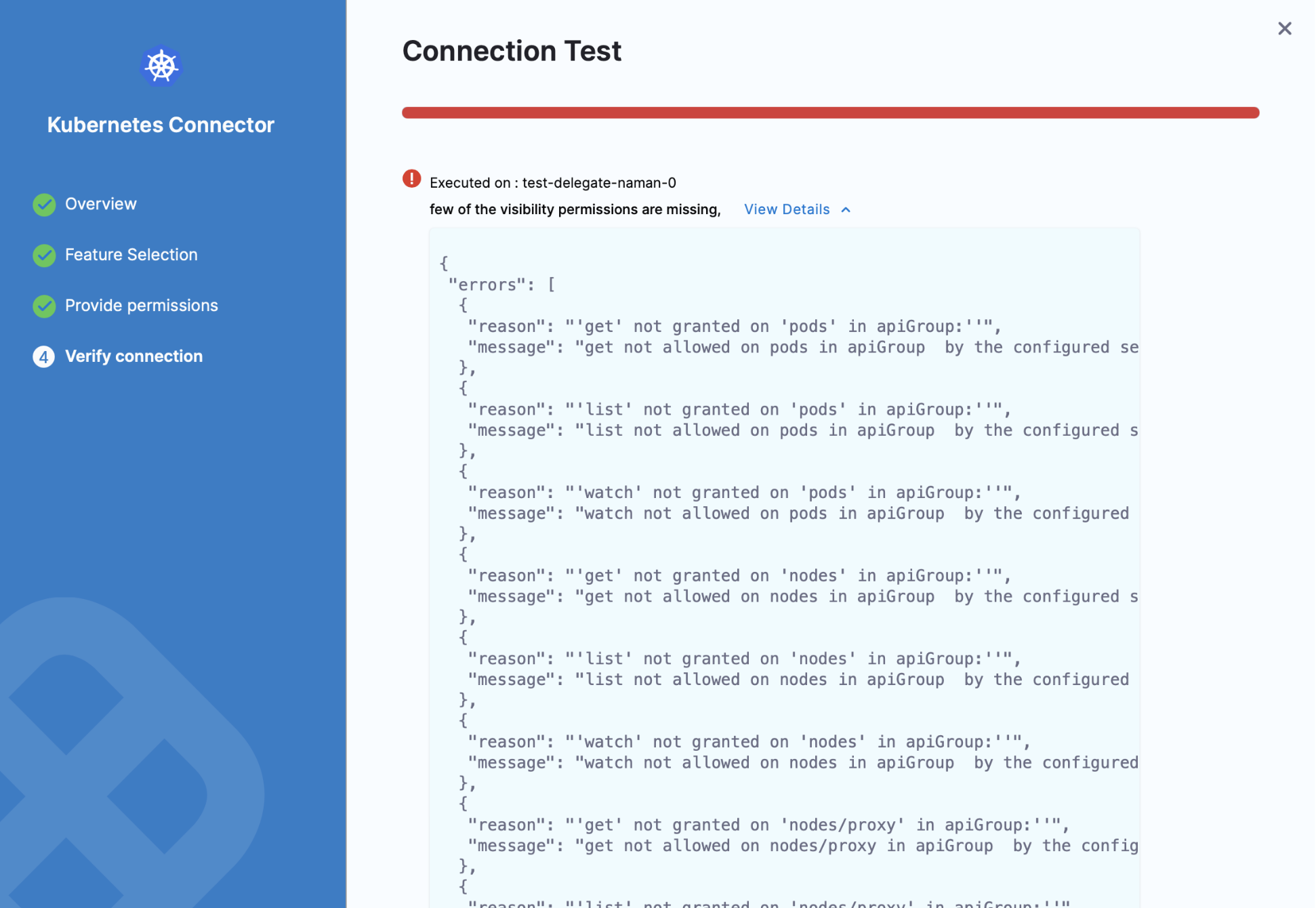 In the Verify connection step, if you get an error message like few of the visibility permissions are missing, then you need to review the CCM permissions required for Harness Delegate.