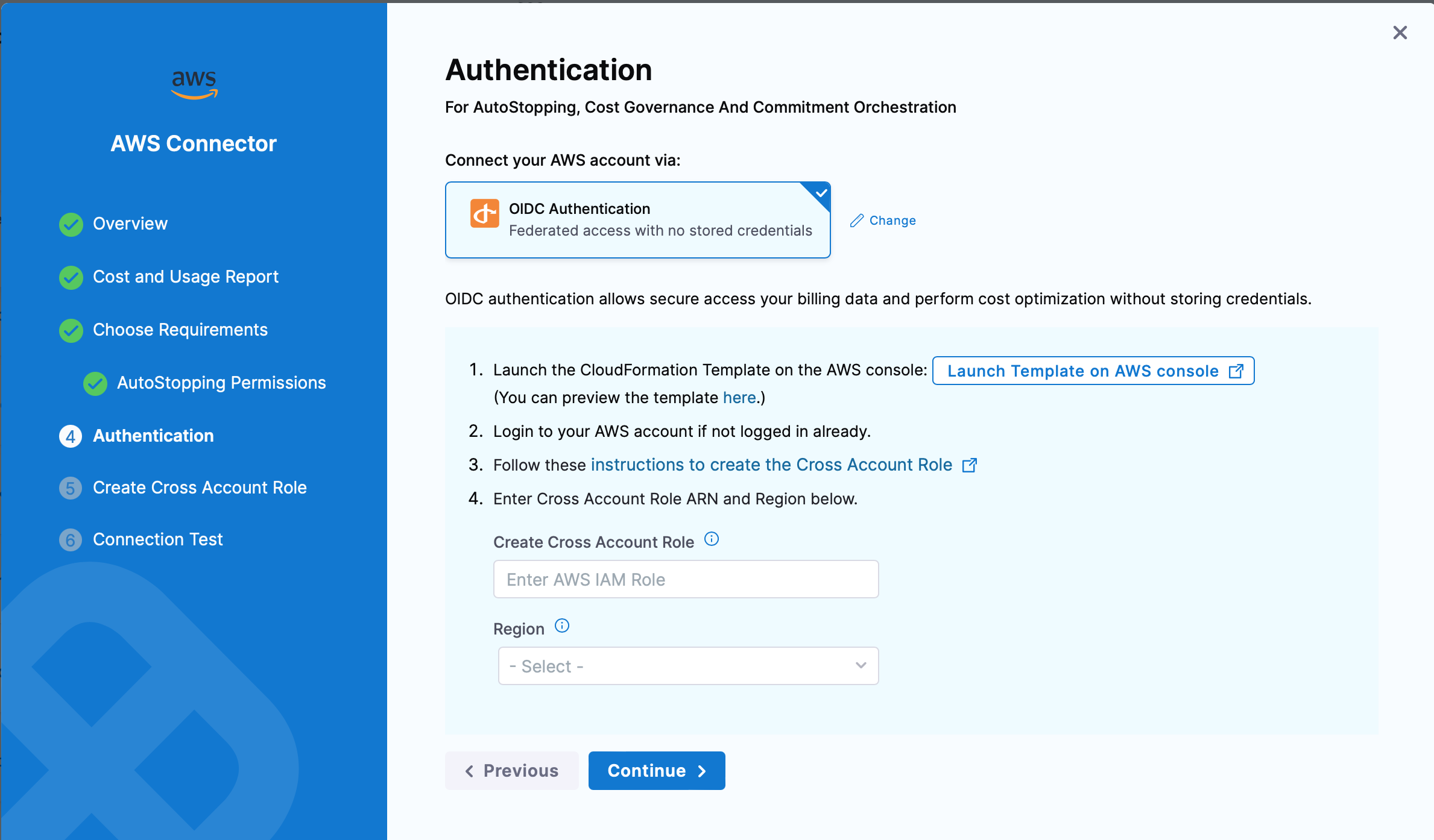 - Enter Cross Account Role ARN and Region in the input boxes on the UI.