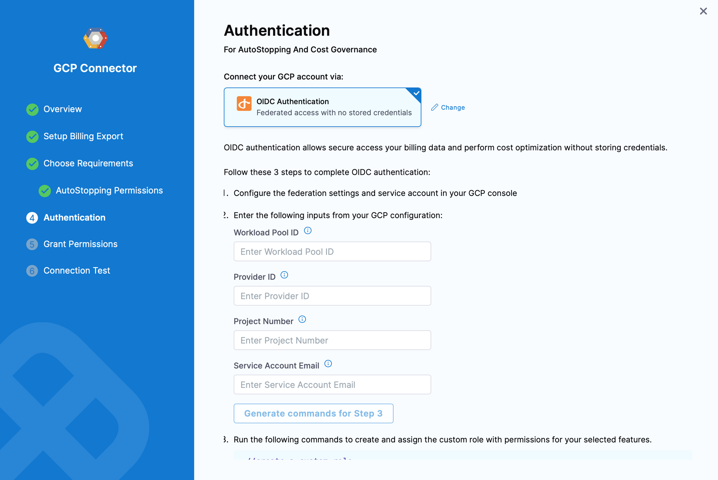 If AutoStopping Granular Rules are selected, you will be prompted to generate commands. Click on Generate commands for step 3 and run the commands listed on screen to create and assign the custom role with permissions for your selected features.