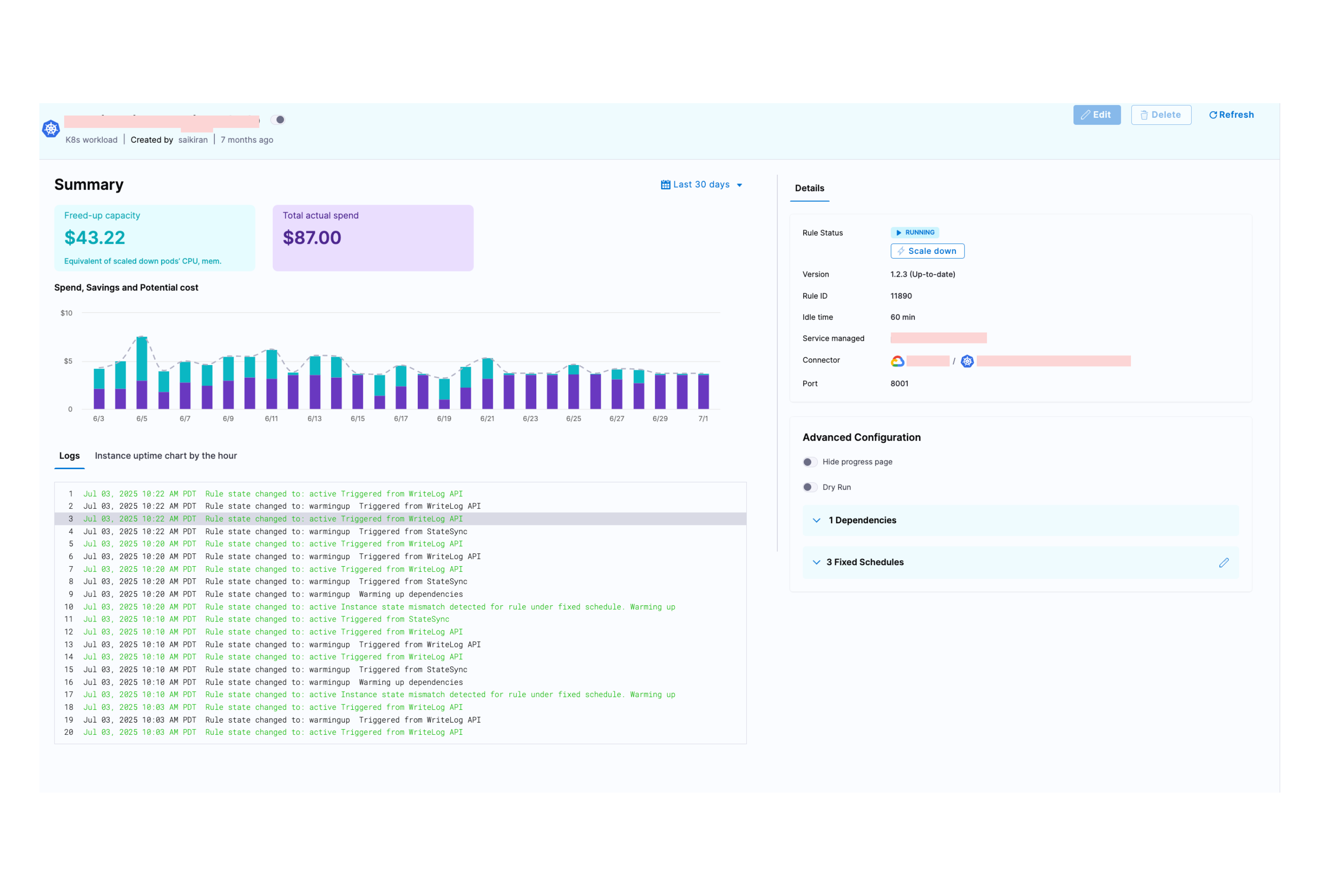 When you click on an AutoStopping rule from the summary page, you're taken to a detailed view that provides comprehensive information about the rule's performance, configuration, and current status. This page helps you monitor and manage your Kubernetes AutoStopping rules effectively.
