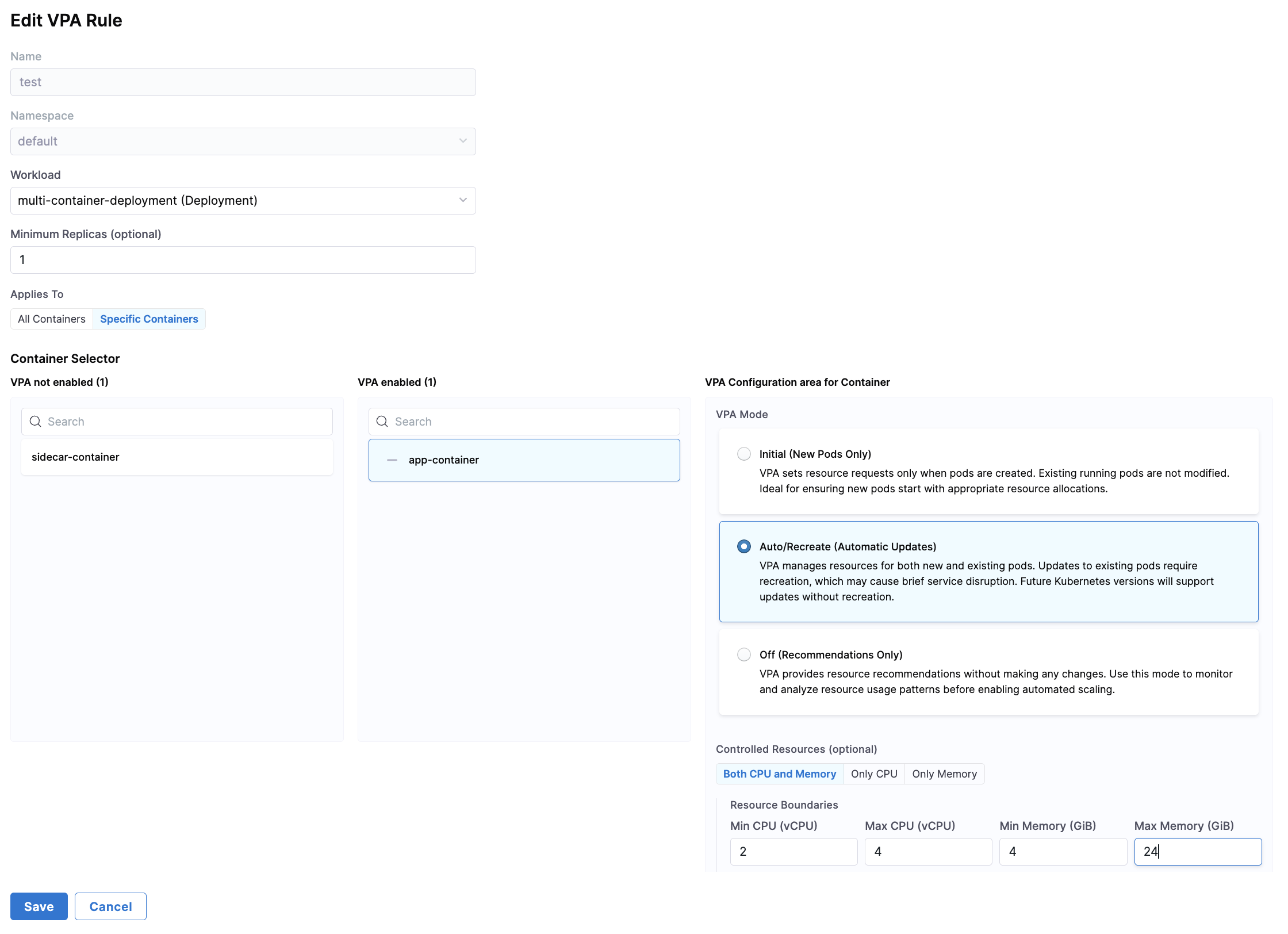 - Initial (New Pods Only): VPA sets resource requests only when pods are created. Existing running pods are not modified. Ideal for ensuring new pods start with appropriate resource allocations.
