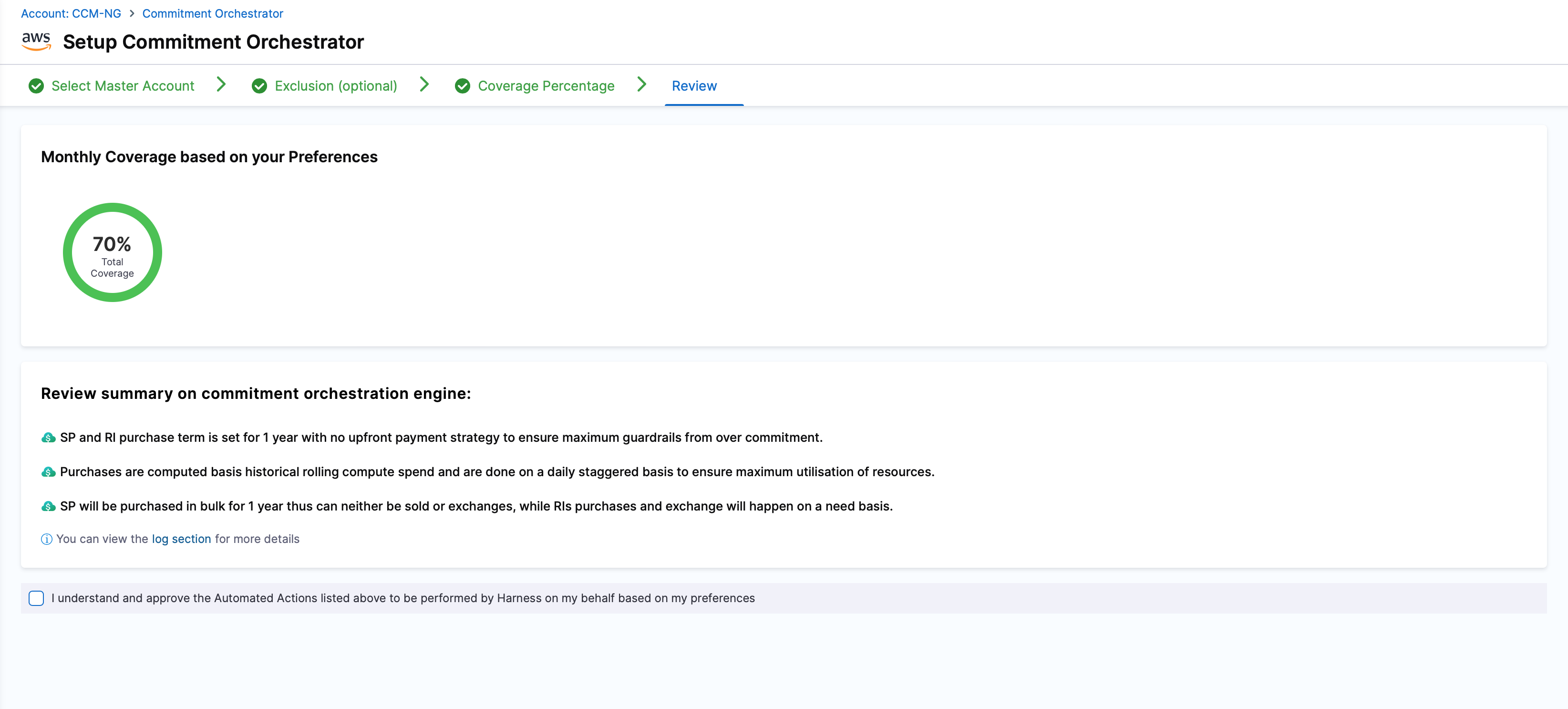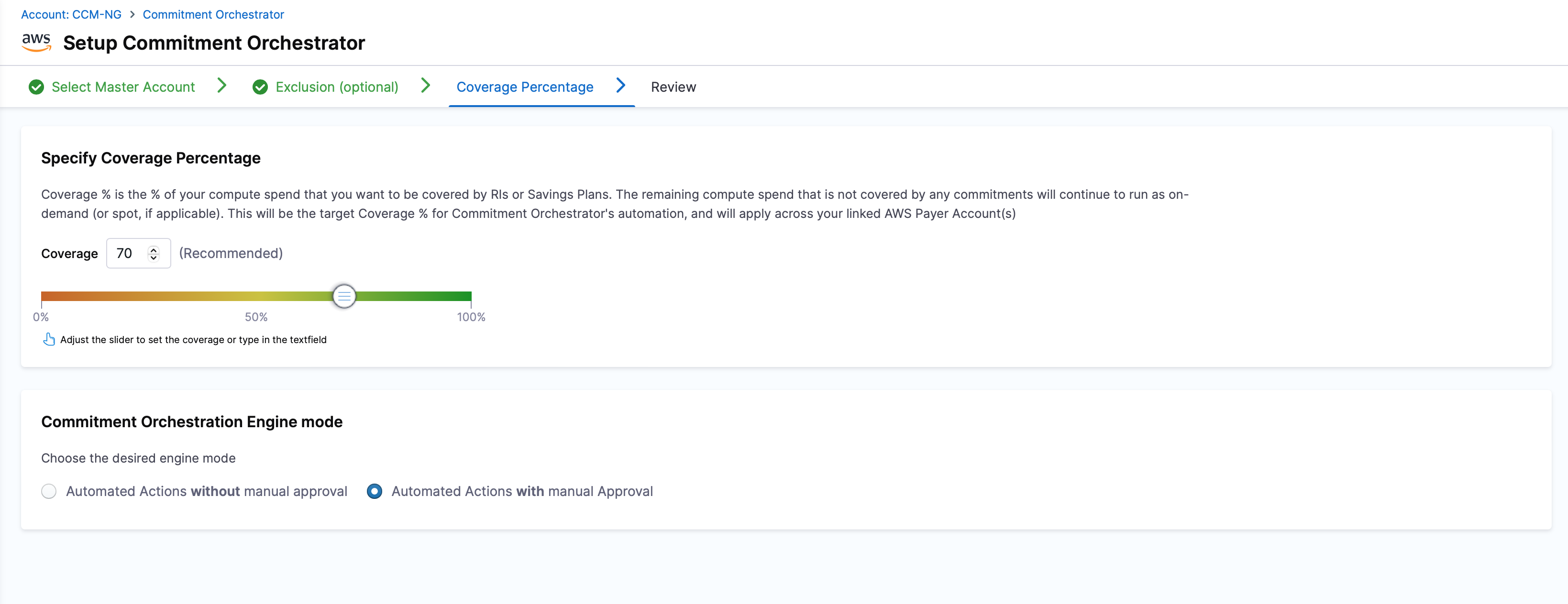 Engine mode: Select your preferred engine mode for commitment orchestration that can either be "Automated Actions without manual approval" or "Automated Actions with manual Approval"