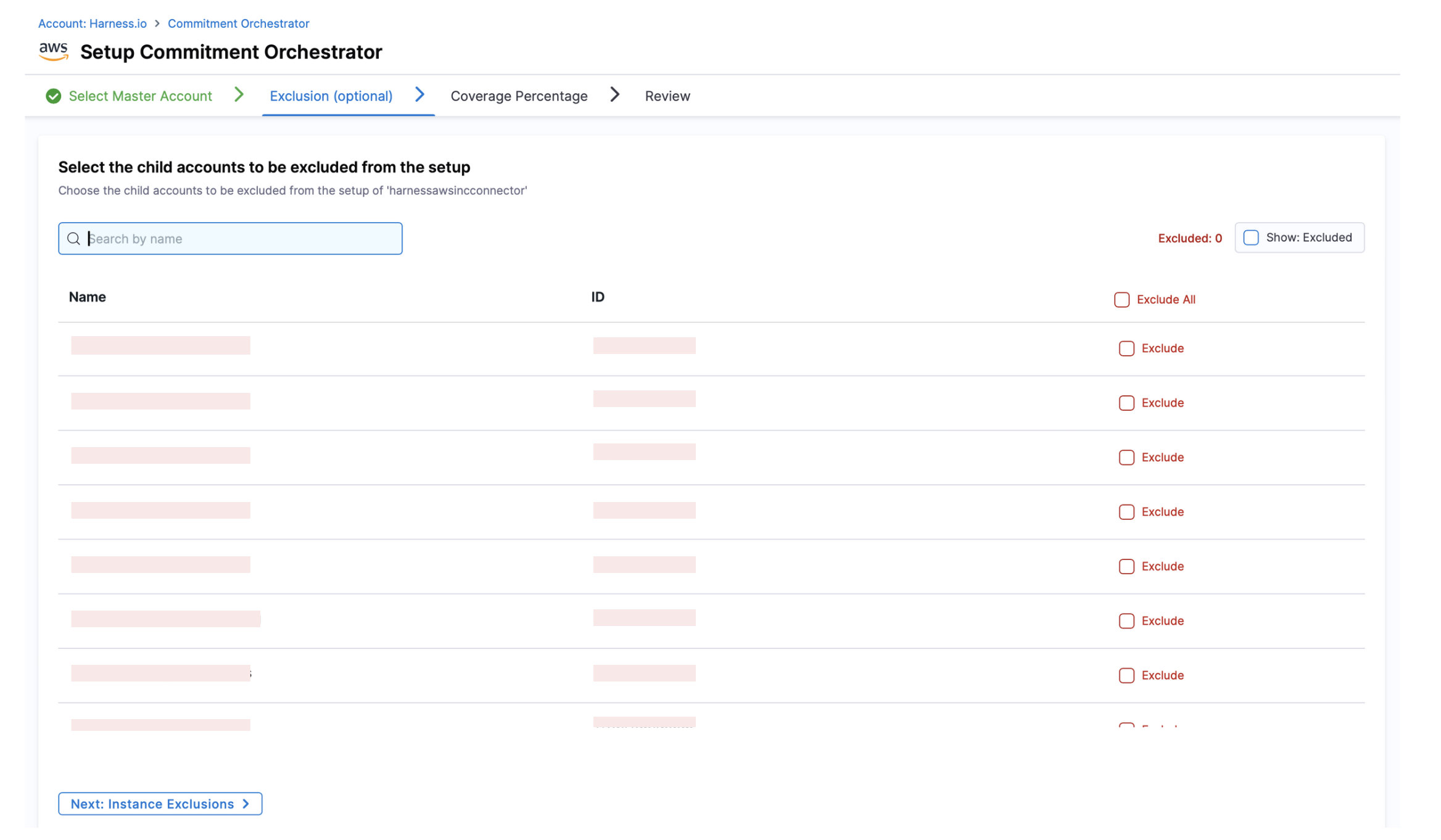 Commitment Orchestrator provides you with an option to choose the child accounts and instances you would like to exclude when orchestrating for Compute Usage.