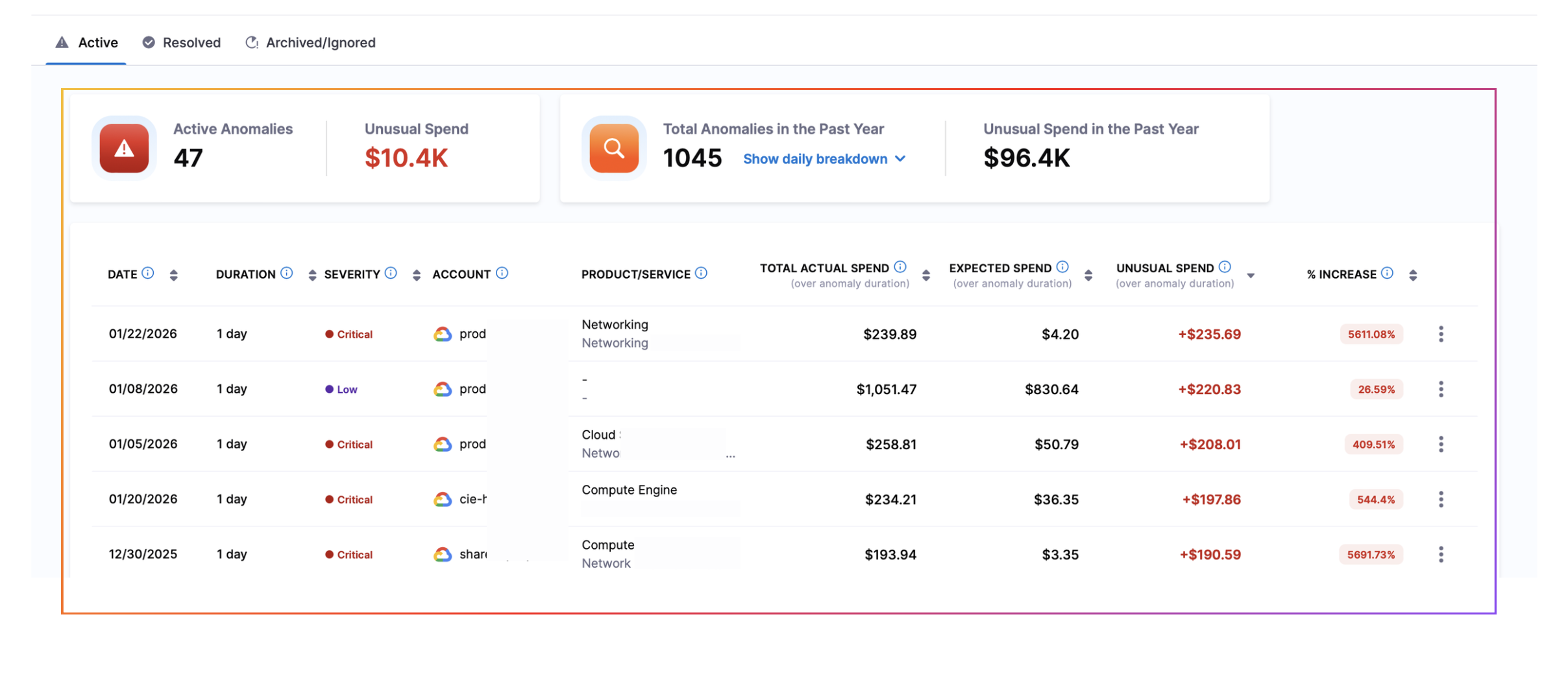 - Unusual Spend: The total additional cost incurred due to active anomalies (difference between actual and expected spend)