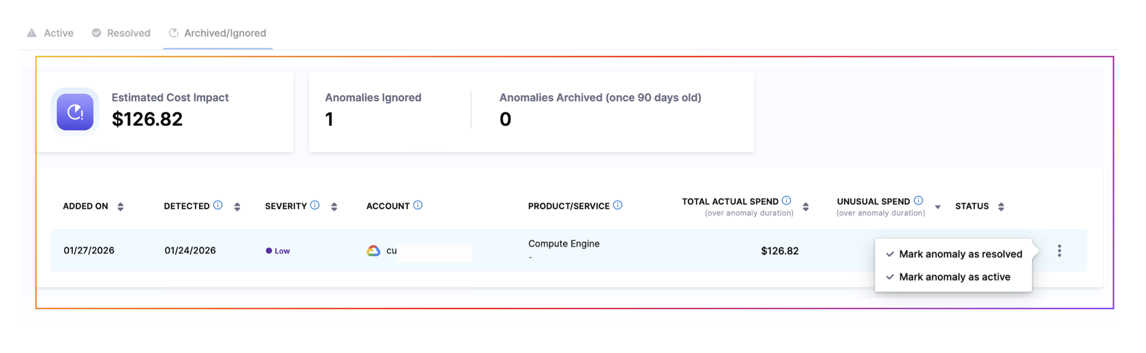 The Archived/Ignored tab contains anomalies that have been either manually ignored or automatically archived once they are 90 days old. This tab serves as a long-term repository for anomalies that don't require active attention.