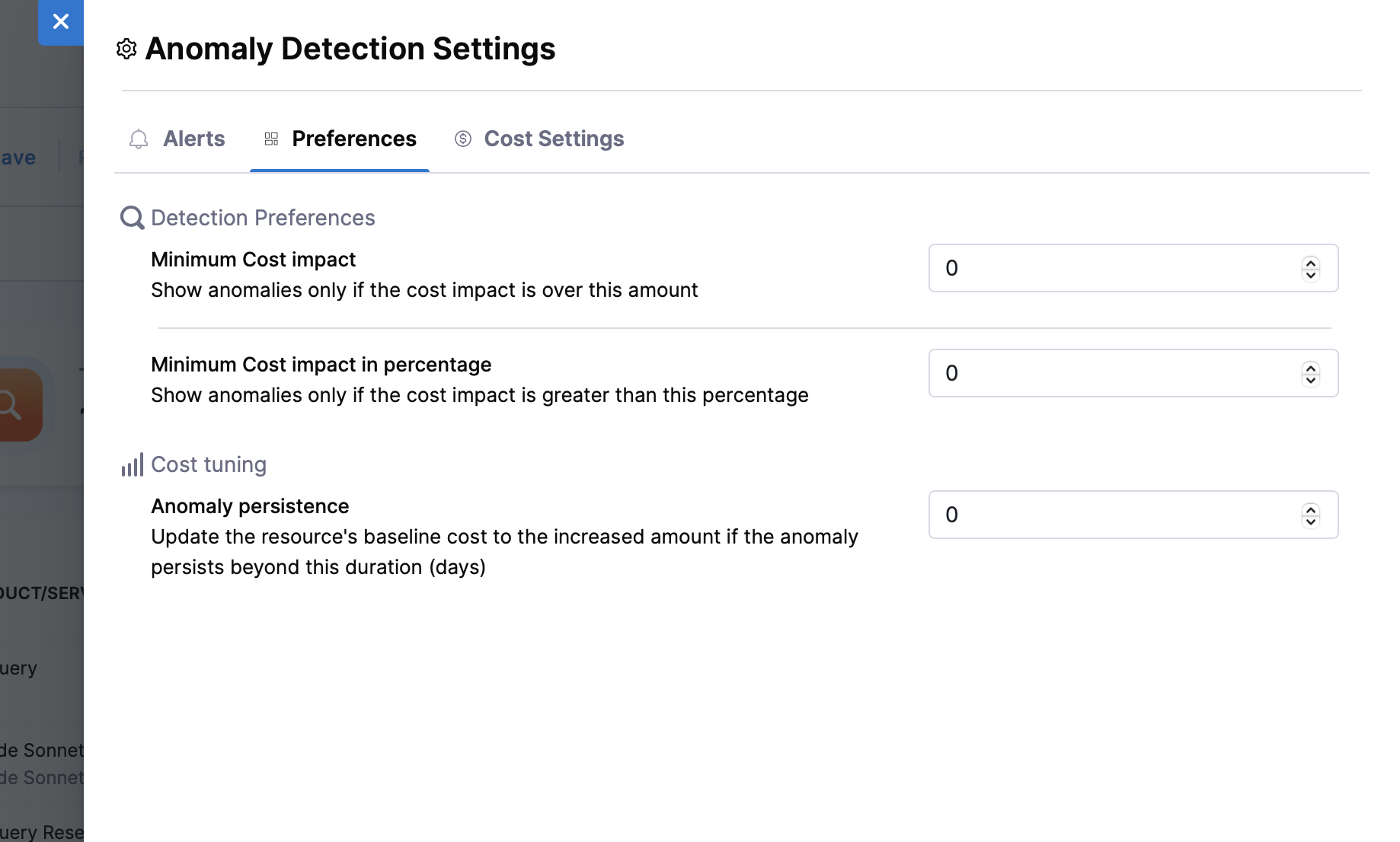 - Minimum Cost Impact (Amount): This setting allows you to set a threshold for the cost impact in USD, meaning that anomalies will only be shown if the financial impact exceeds the specified amount.