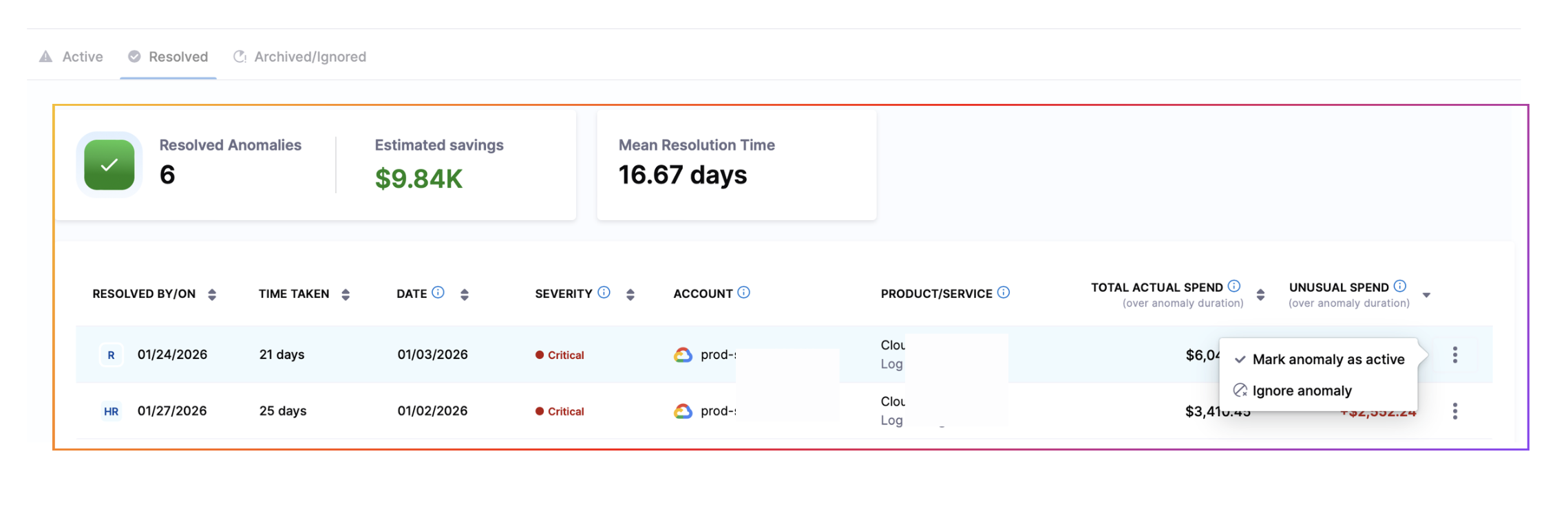 Resolved anomalies remain in this tab for reference and are automatically archived after 90 days.