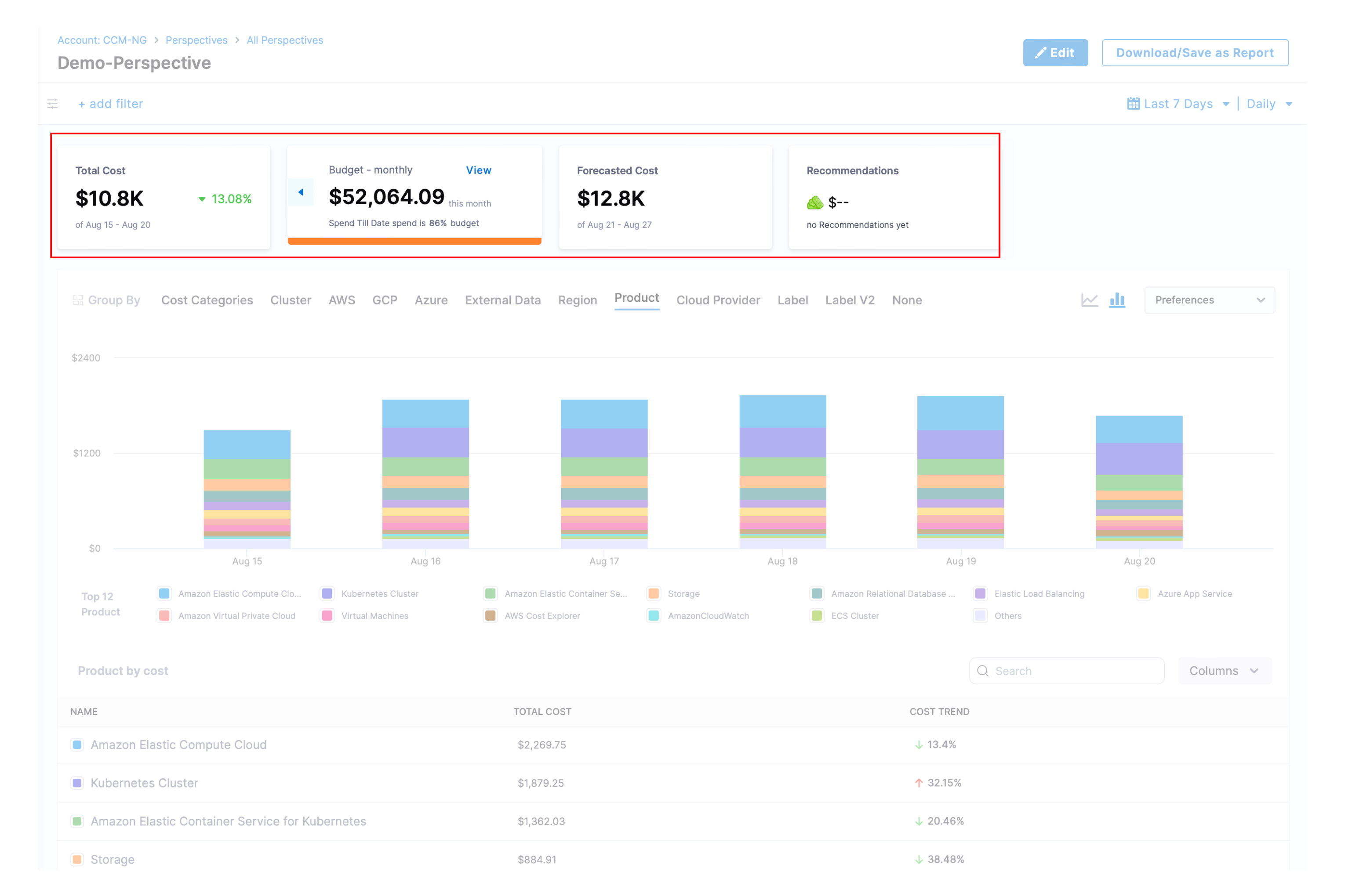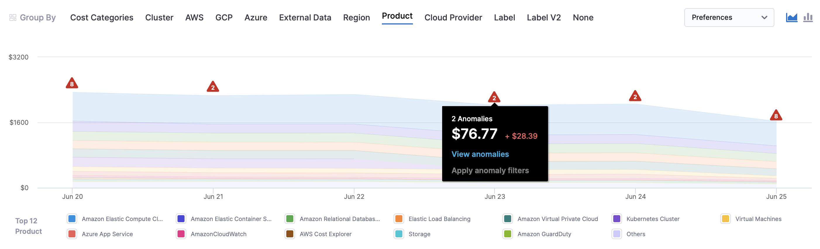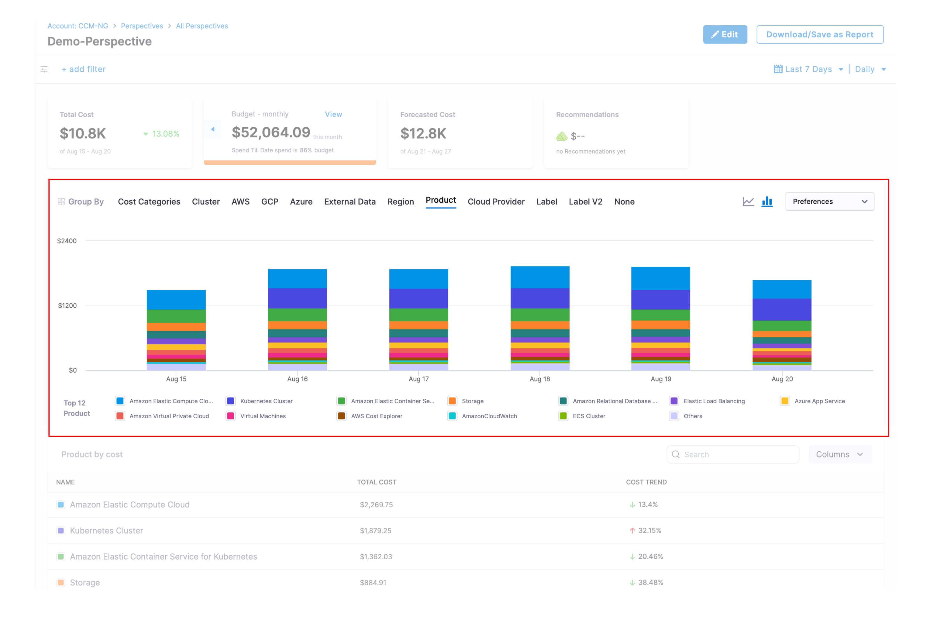 - Cloud Provider: Filter and group costs by the cloud service provider (AWS, GCP, Azure, or Kubernetes clusters) to analyze spending across different cloud platforms.