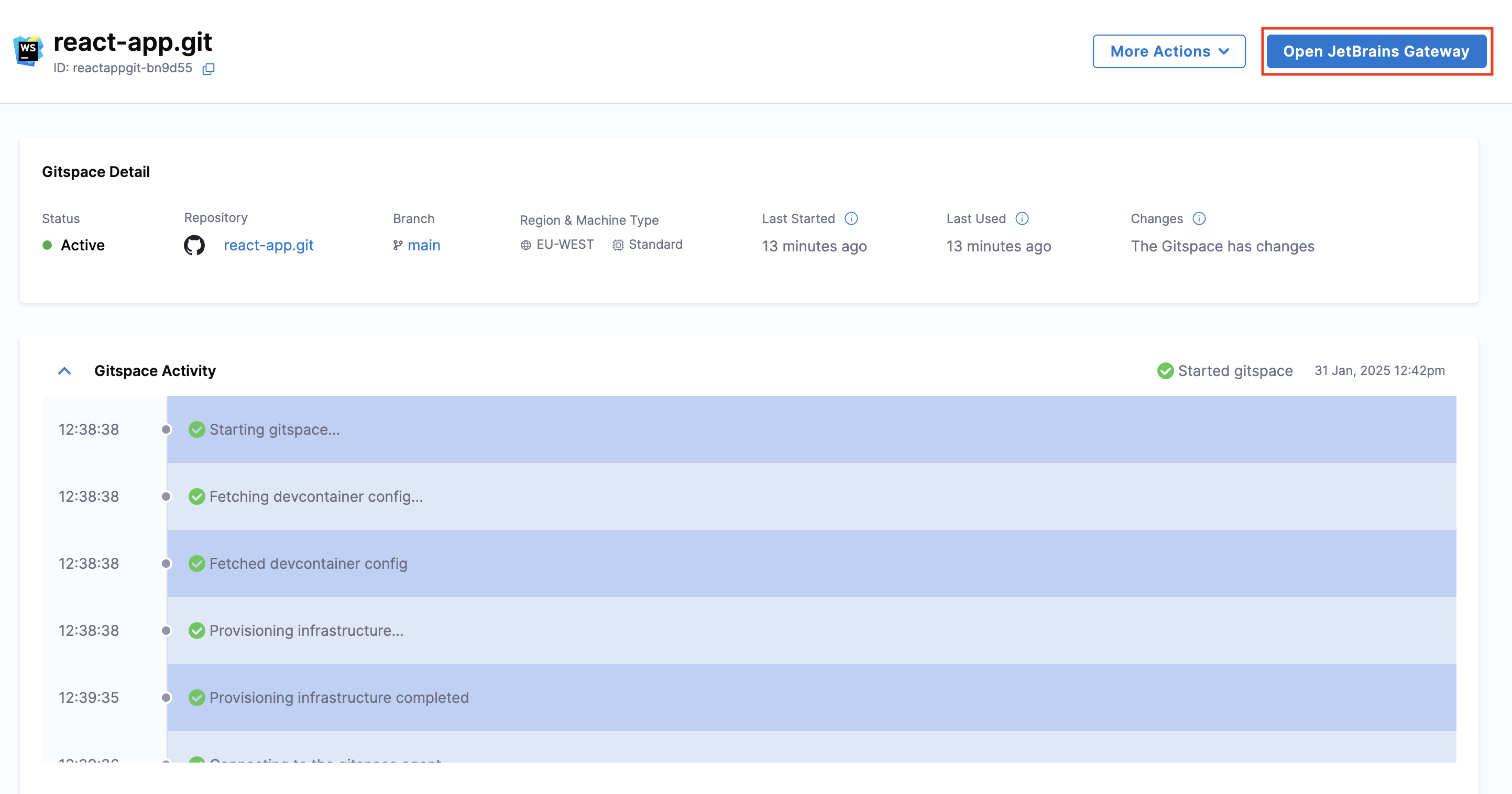 - Once the Gitspace is created and running, click on the "Open JetBrains Gateway" button.