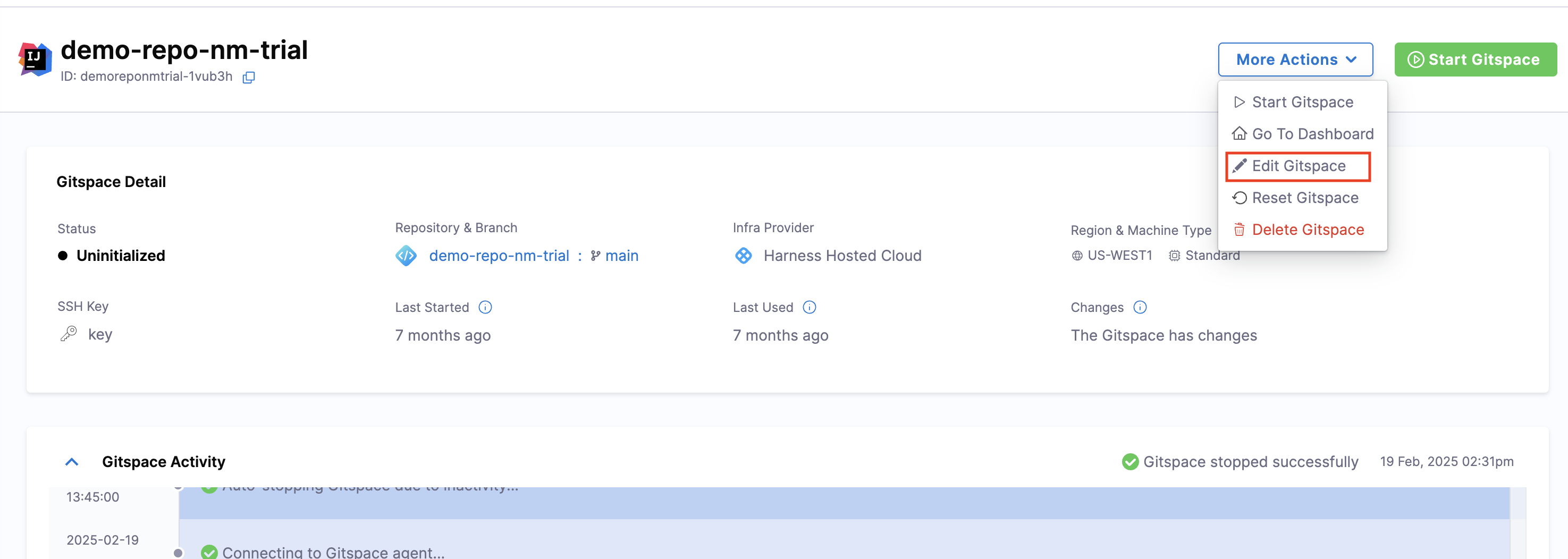 - Gitspace Details: Click on the More Actions menu of your Gitspace and click on Edit Gitspace.