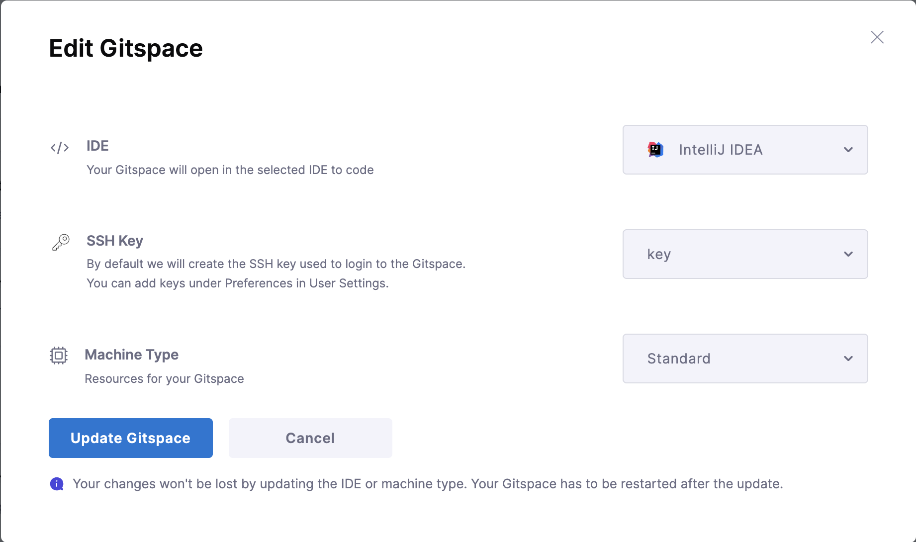 - IDE: You can change the IDE of your Gitspace to any other IDE as well.