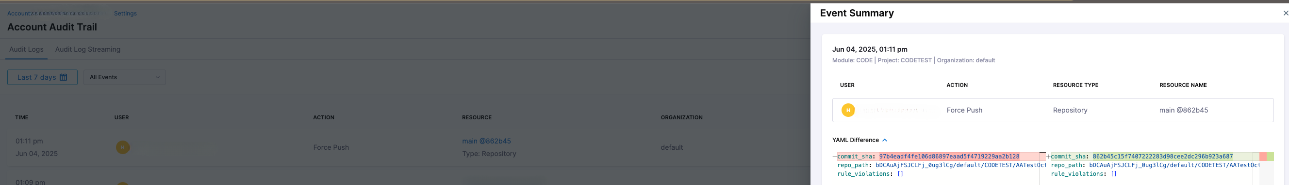 Harness Code supports audit logging for key repository events, helping you track critical actions and enforce accountability across your codebase.