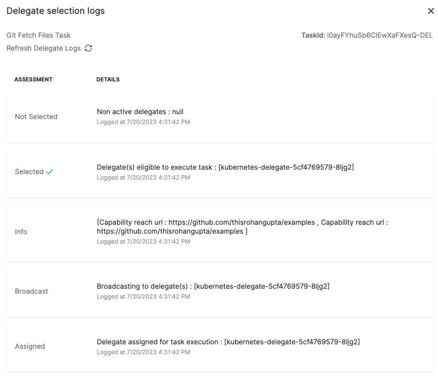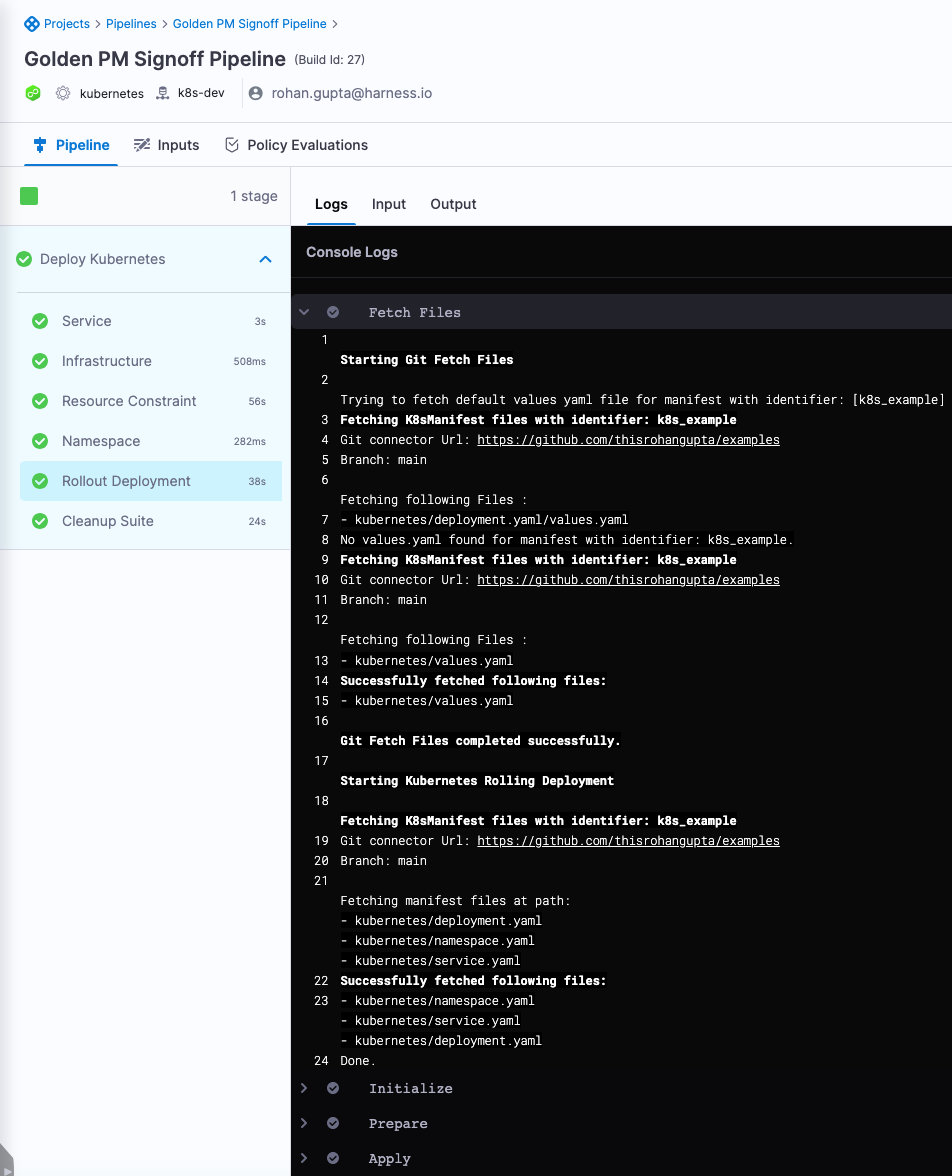 - The fetch files task leverages the GitHub connector configured in the service to fetch the manifests.
