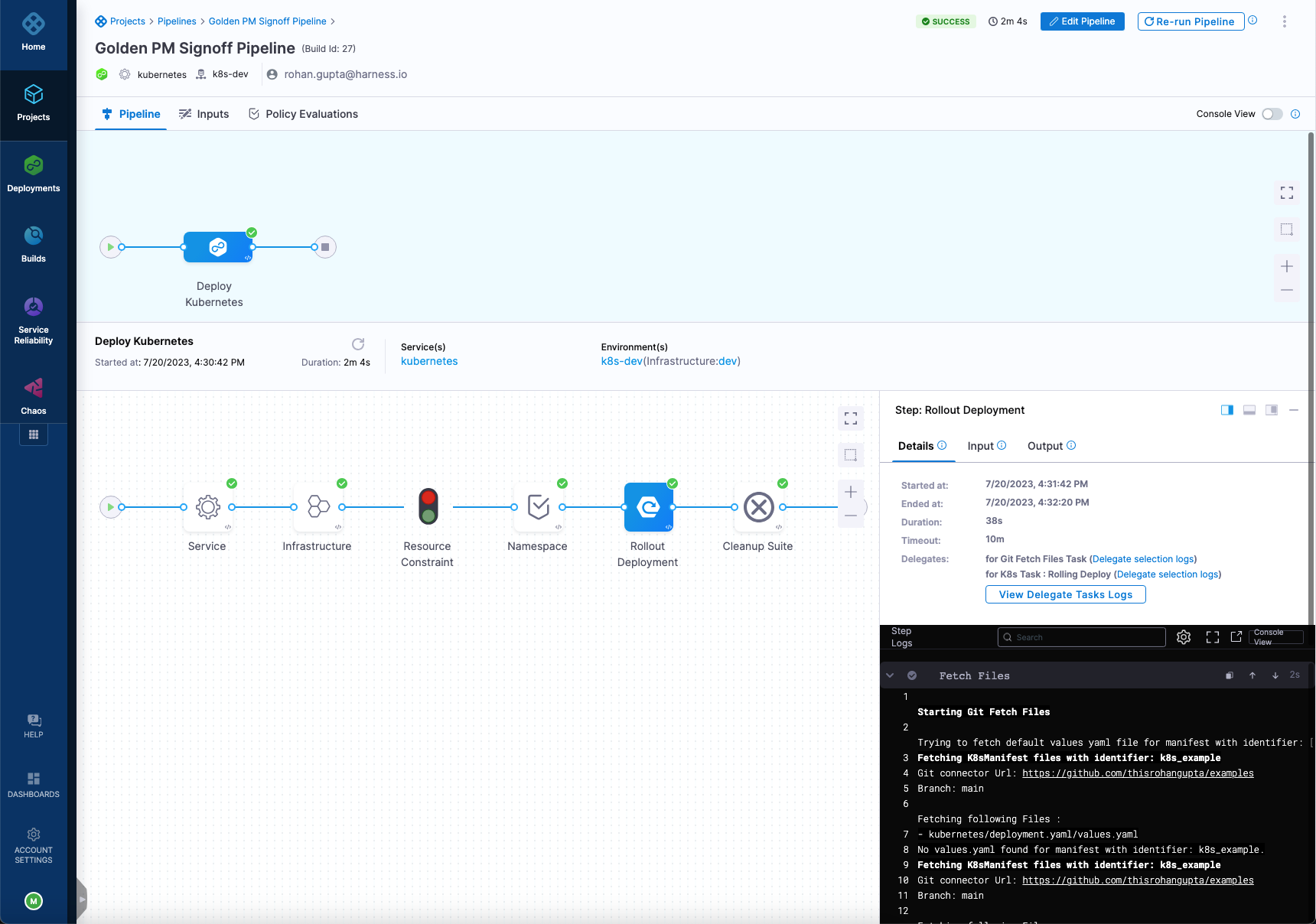 In this example, there is Rollout Deployment step to deploy the service to the environment.