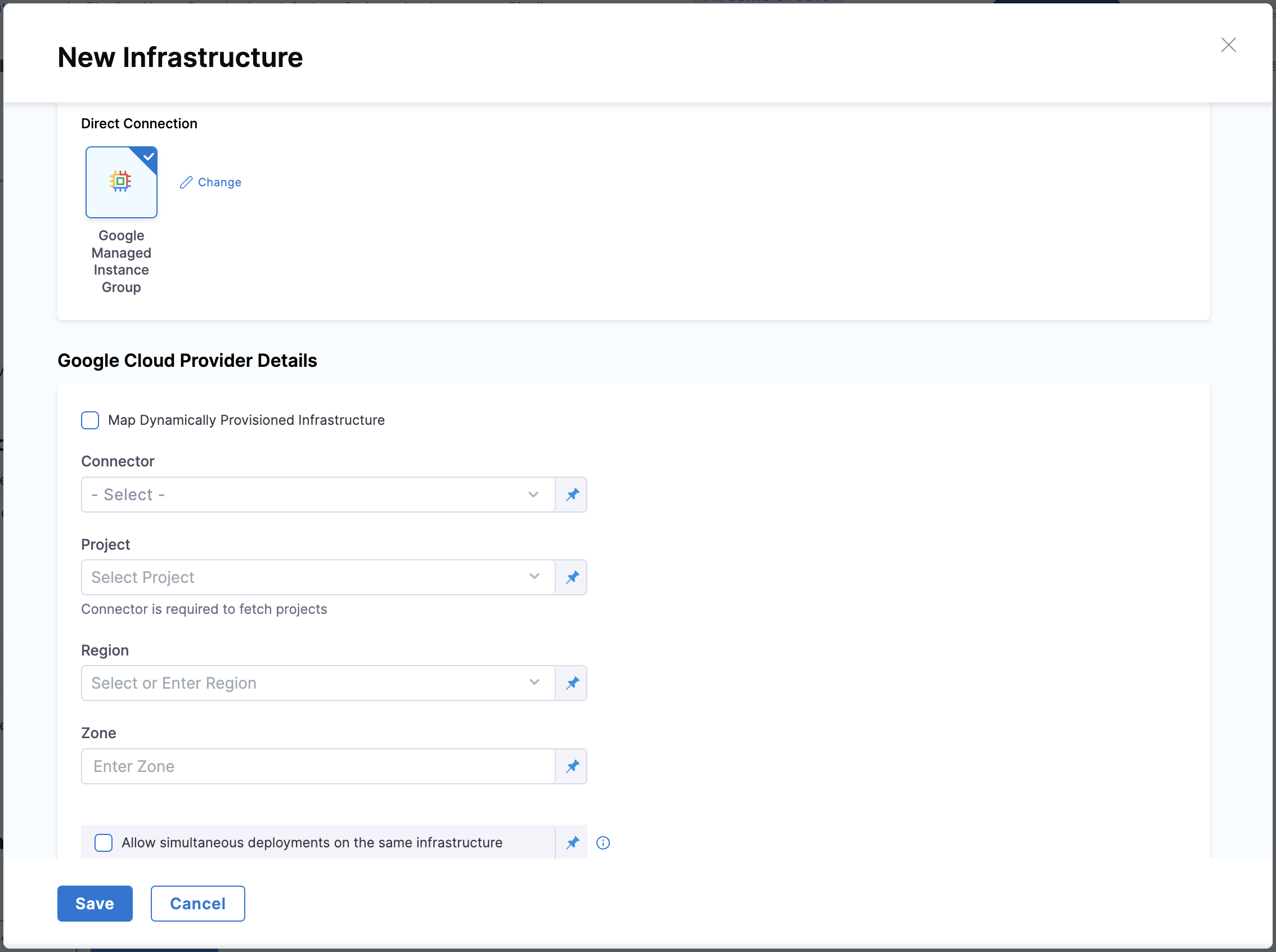 The infrastructure definition specifies where and how Harness deploys your MIG in GCP. This includes the GCP project, region, and optionally a specific zone for zonal deployments.