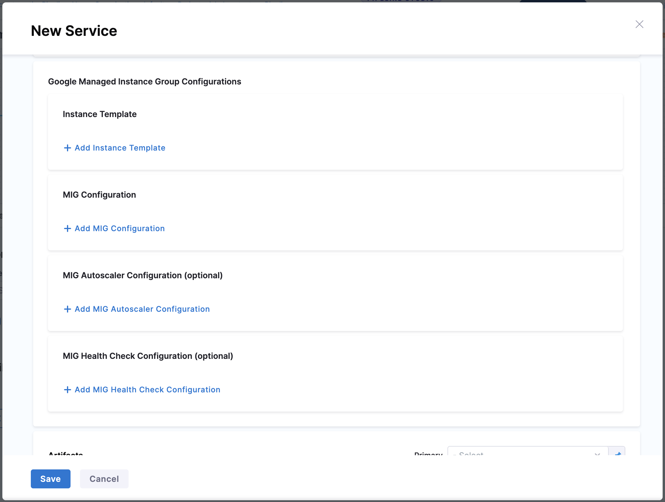 Harness needs to know which GCP Compute Engine image to use for your MIG instances. Currently, only Google Compute Engine (GCE) Image artifacts are supported for MIG deployments. The artifact configuration can override the image specified in your instance template, giving you flexibility to deploy different image versions without modifying the template.