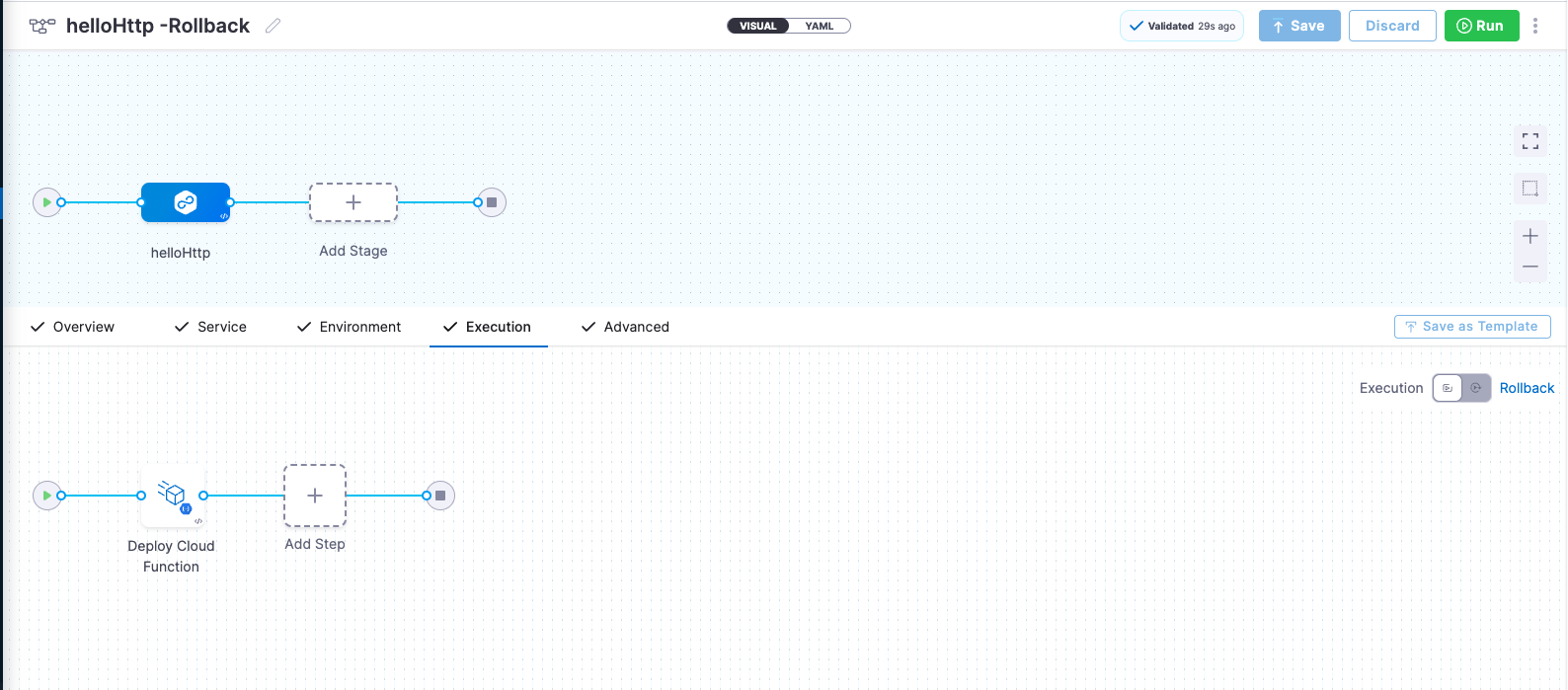 harness pipeline --file "/google_cloud_function/2nd_gen/canary-pipeline.yml" apply - In Harness, you can switch to the Visual editor and confirm the pipeline stage and execution steps as shown below.