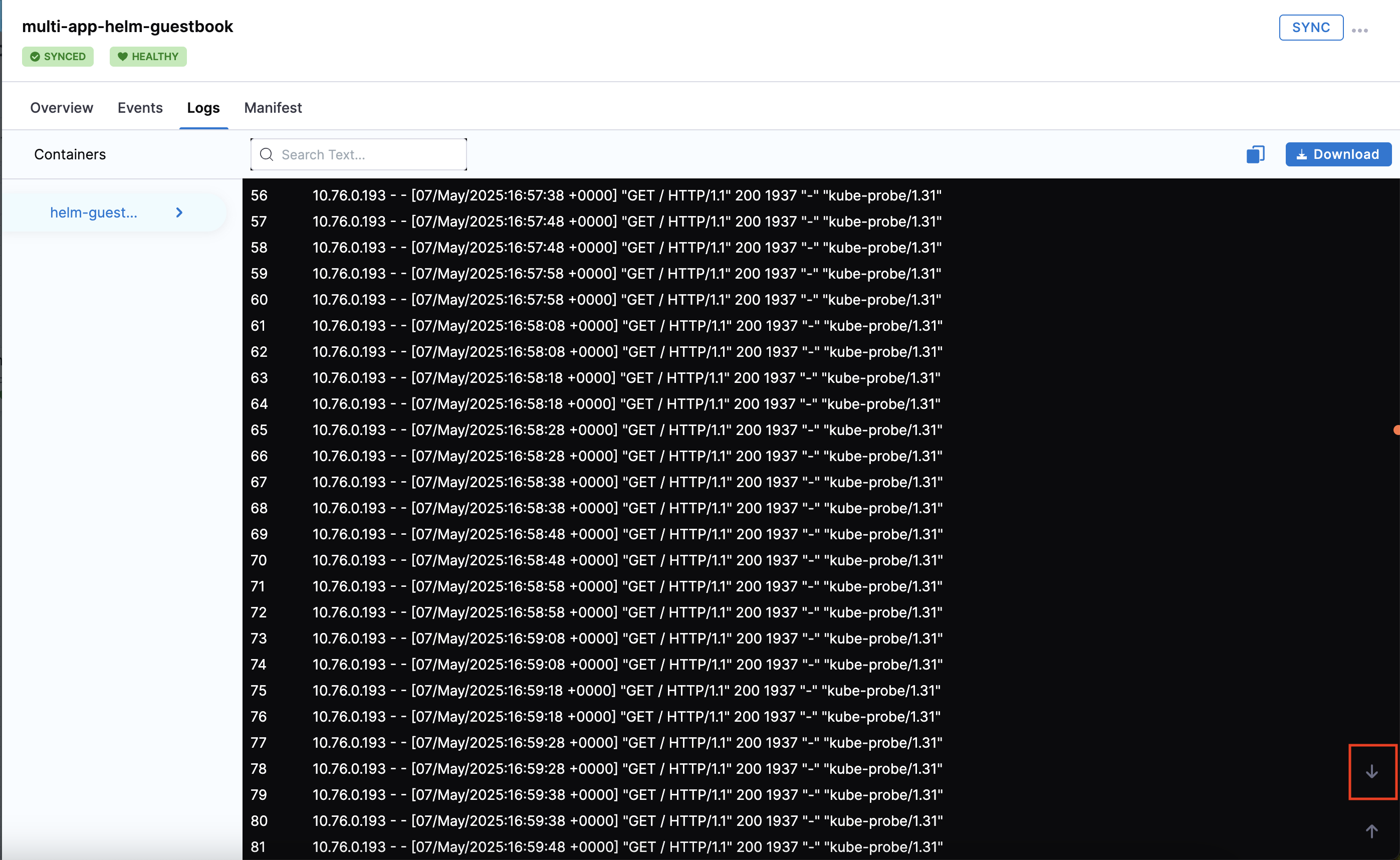 - Logs: The logs of the resource. These logs are searchable, copyable, and downloadable. You can also view the log tail by clicking on the down arrow in the bottom right corner (click image below).