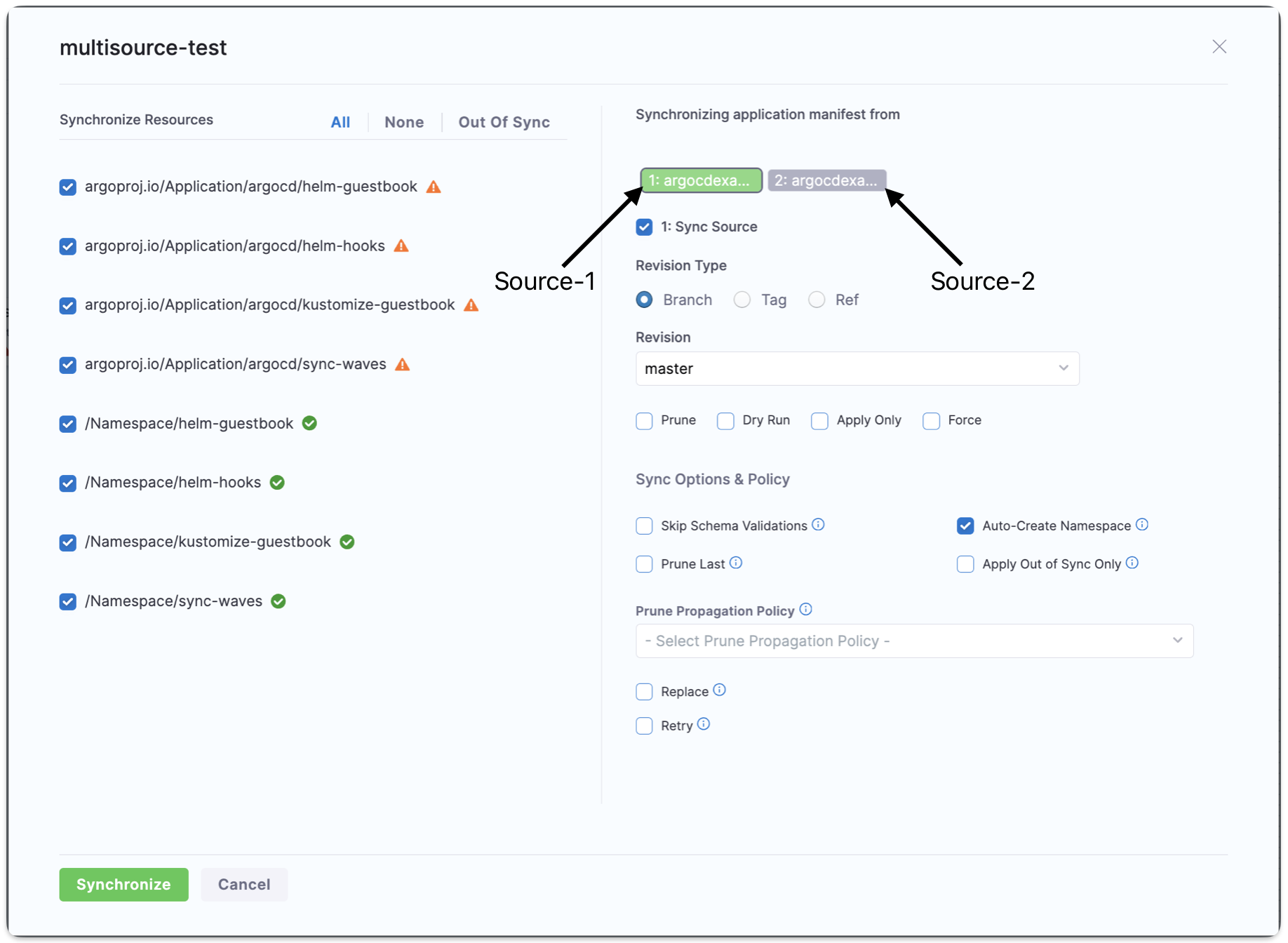 After the application with multiple source is created, you can also choose which source to sync with the application during the sync operation. By default, all applications will be synced.