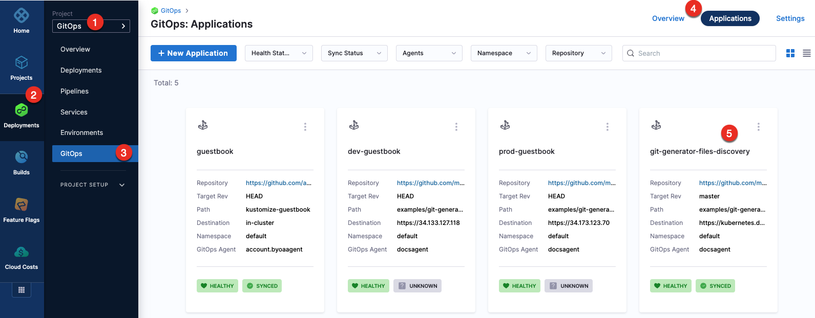 In your GitOps project, go to Deployments > GitOps > Applications, and then select your application.