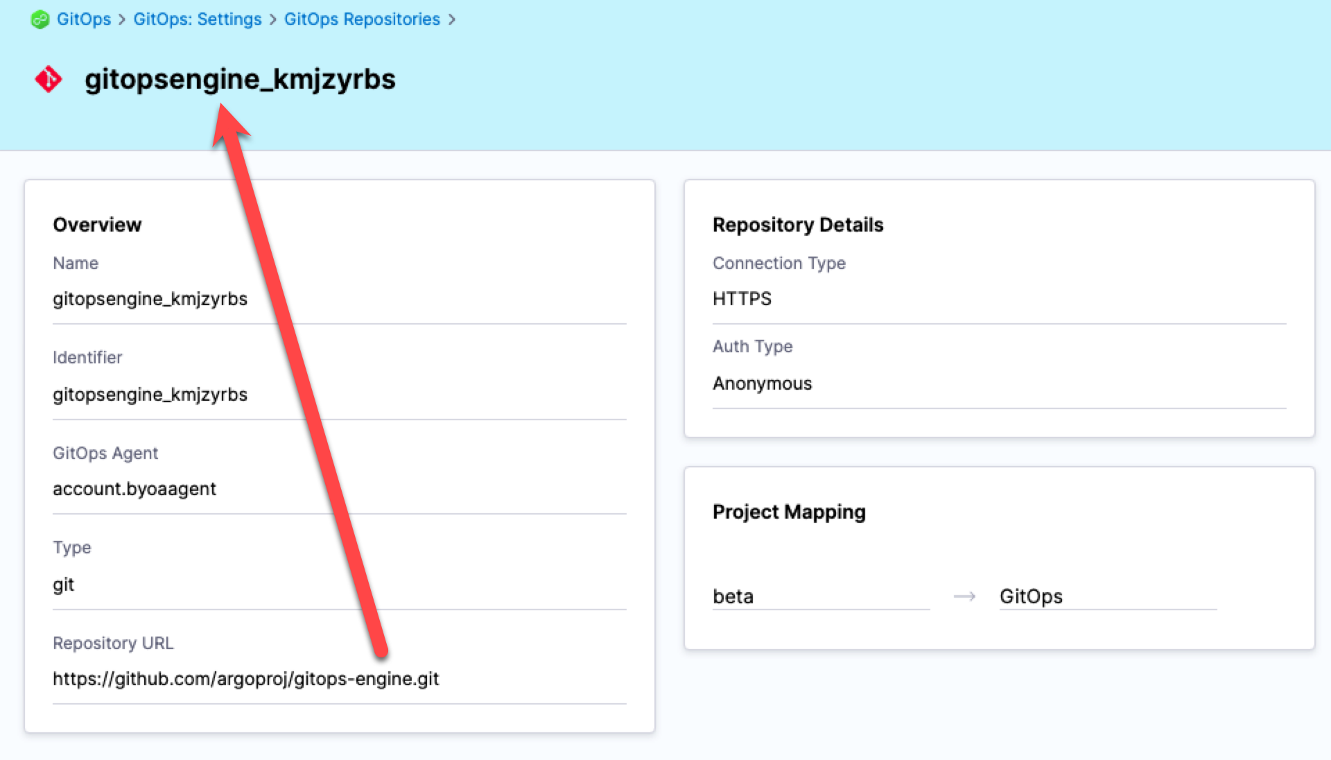 For example, the Argo CD repository https://github.com/argoproj/gitops-engine.git is named gitopsengine_kmjzyrbs in Harness.