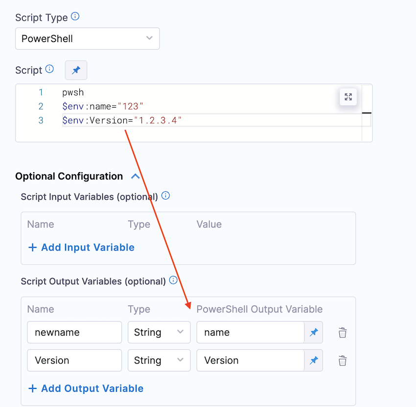The Output Variables is used to export variables from the script to other steps in the stage.