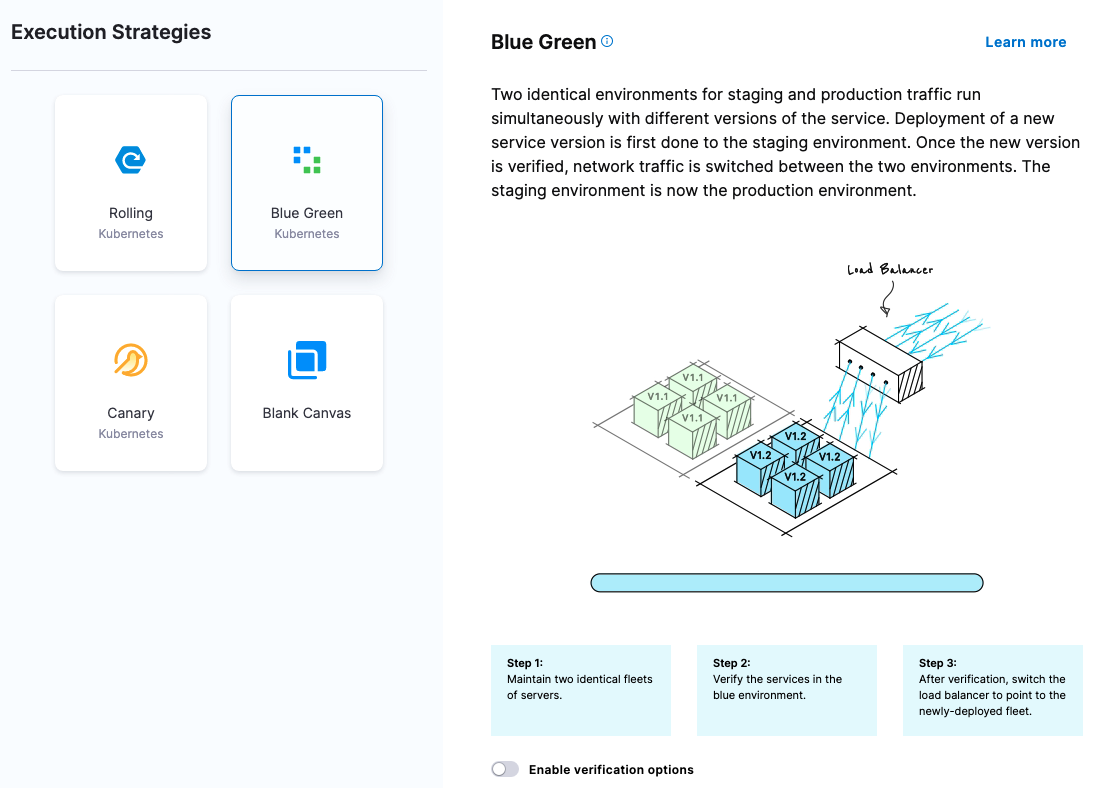 You have likely heard terms like blue/green and canary when it comes to deploying code and applications into production. These are common deployment strategies, available in Harness CD as stage strategies, along with others.