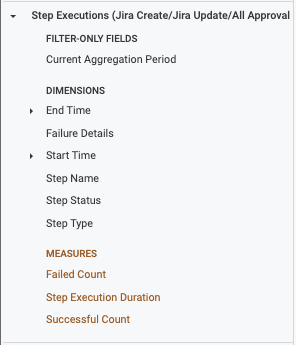 Using fields from Jira Step Execution automatically filters the data to stages that contain Jira steps (Create, Update, Approval).