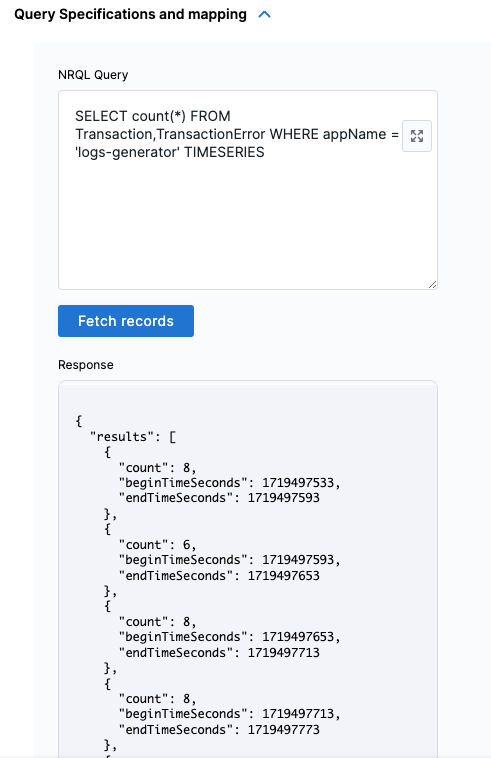 - In Query Specifications and mapping, enter the NRQL Query, and then select Fetch Records. (Optional: Enter the NRQL for specified metrics with a