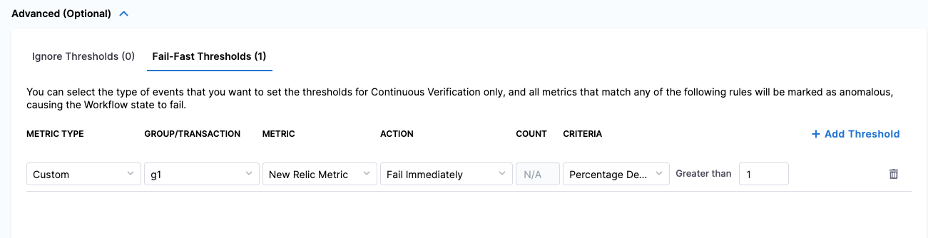 Expand Advanced (Optional), go to the Fail-Fast Thresholds tab, and then select Add Threshold.