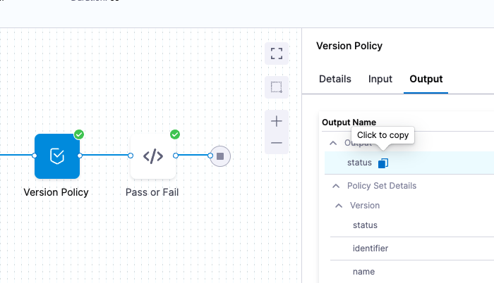 <+execution.steps.[policy step Id].output.status><+execution.steps.[policy step Id].output.policySetDetails.Example.status>