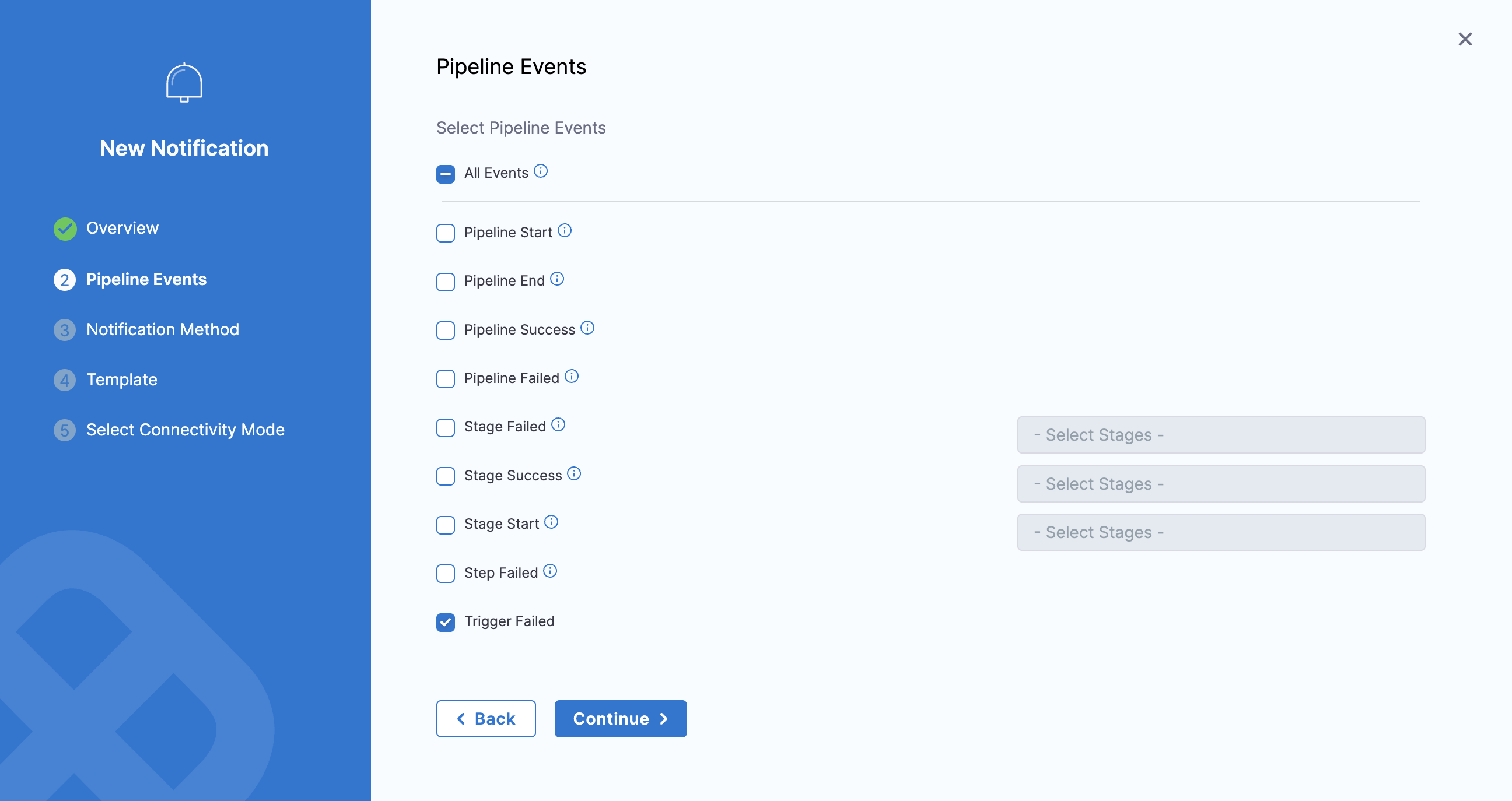 Event notifications are set up using Notification Rules in your pipeline. You select the types of events to send, and then select how you want to send notifications. When those events occur, Harness sends event information to those channels and recipients.