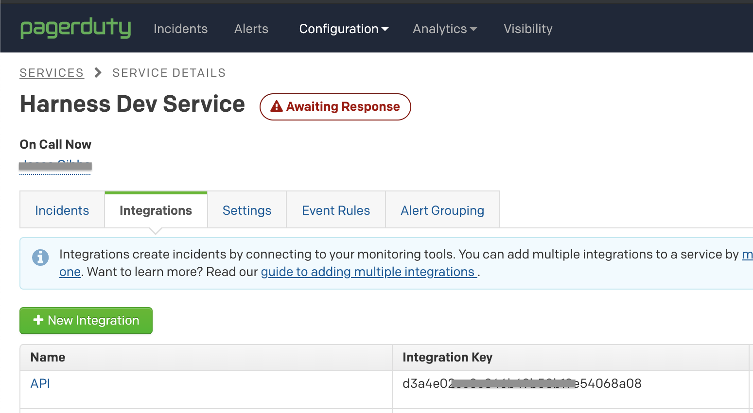 You can copy or paste this key from PagerDuty's Configuration > Services > Service Details dialog > Integrations tab, as shown below.