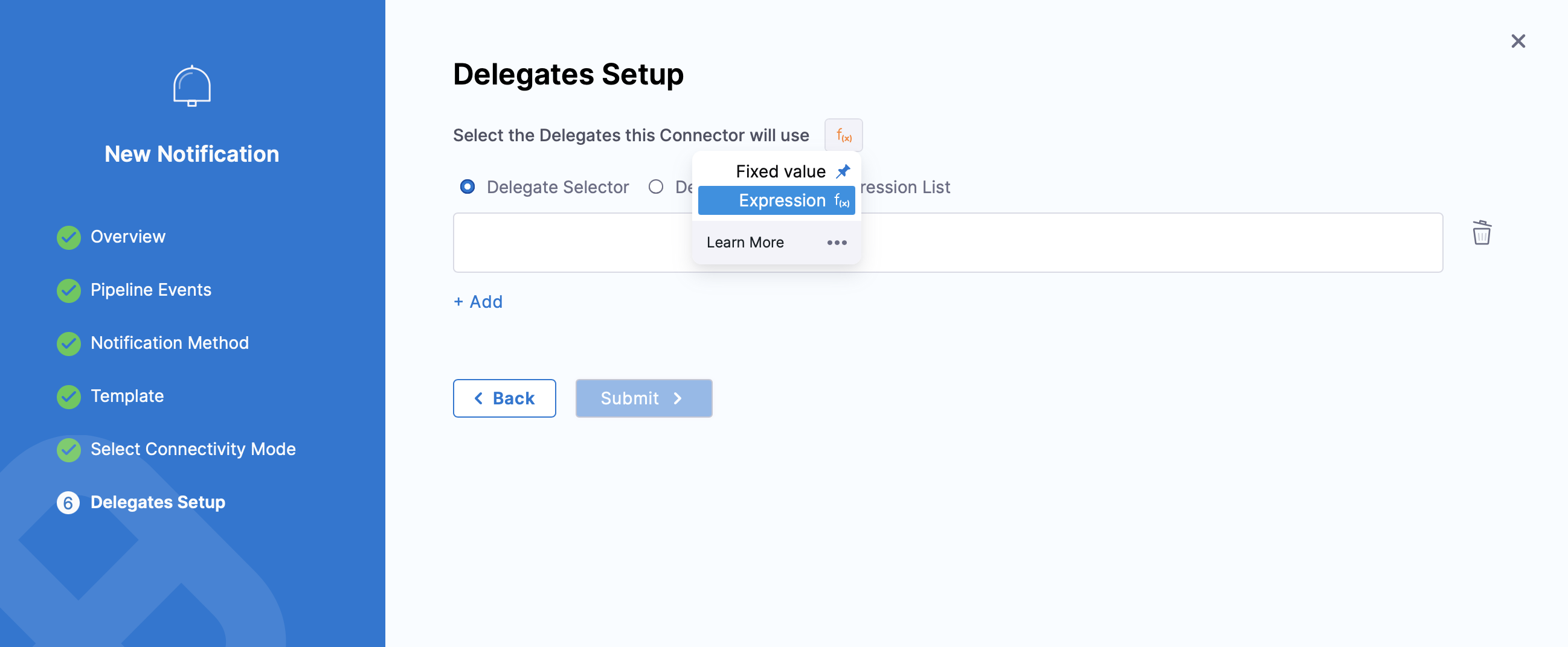 Currently, the feature that allows you to pass Expressions for selecting delegates in Pipeline Notifications is behind the feature flag PIPE_SUPPORT_DELEGATE_EXPRESSIONS_FOR_PIPELINE_NOTIFICATIONS.