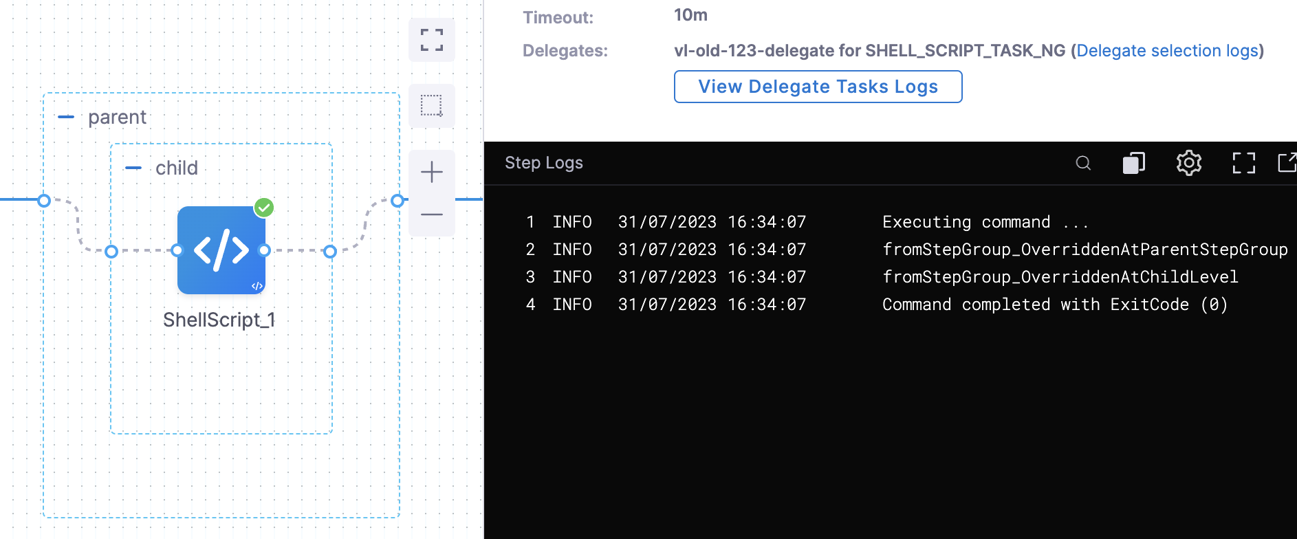 parentstep group also has a variablesvarParentwith the valueDefinedAtParentLevel. Thechildstep group overrides this with the valueOverridenByChildStepGroup. - The