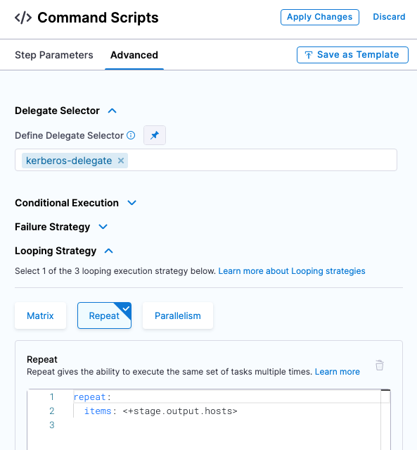 Also, the looping strategy needed to run the Command step on each target host is set automatically to Repeat.