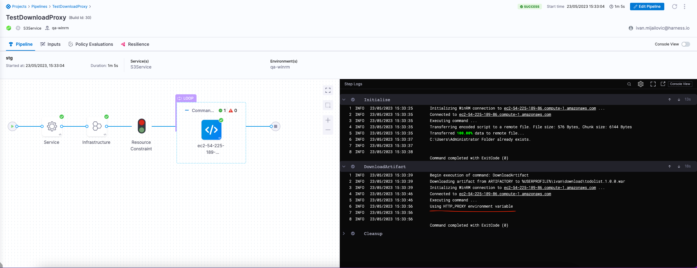 While the pipeline is running, you will see Using HTTP_PROXY environment variable log message for the Download Artifact command type. This message indicates that the proxy is used on the target machine.