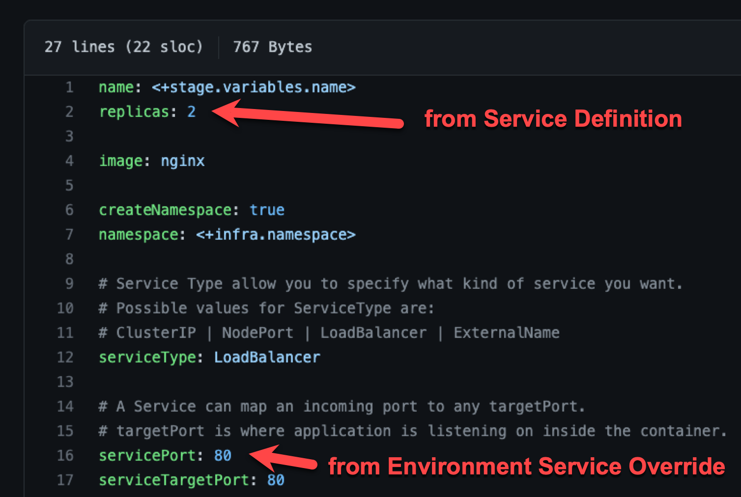 The servicePort: 80 from the environment Service Overrides values YAML is merged with the Service Definition's replicas: 2 in the values YAML: