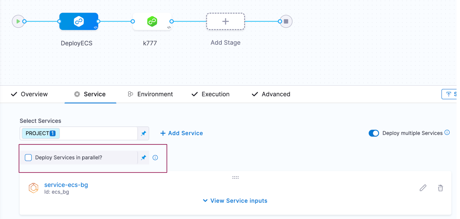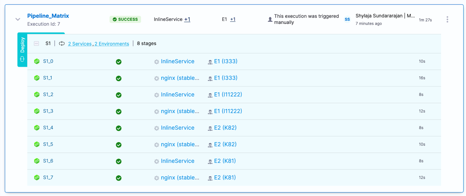 Pipelines can be executed with multiple services and environments. Configured services and environments are mapped to different stages and each stage executes a Service ,Environment and Infrastructure belonging to environment