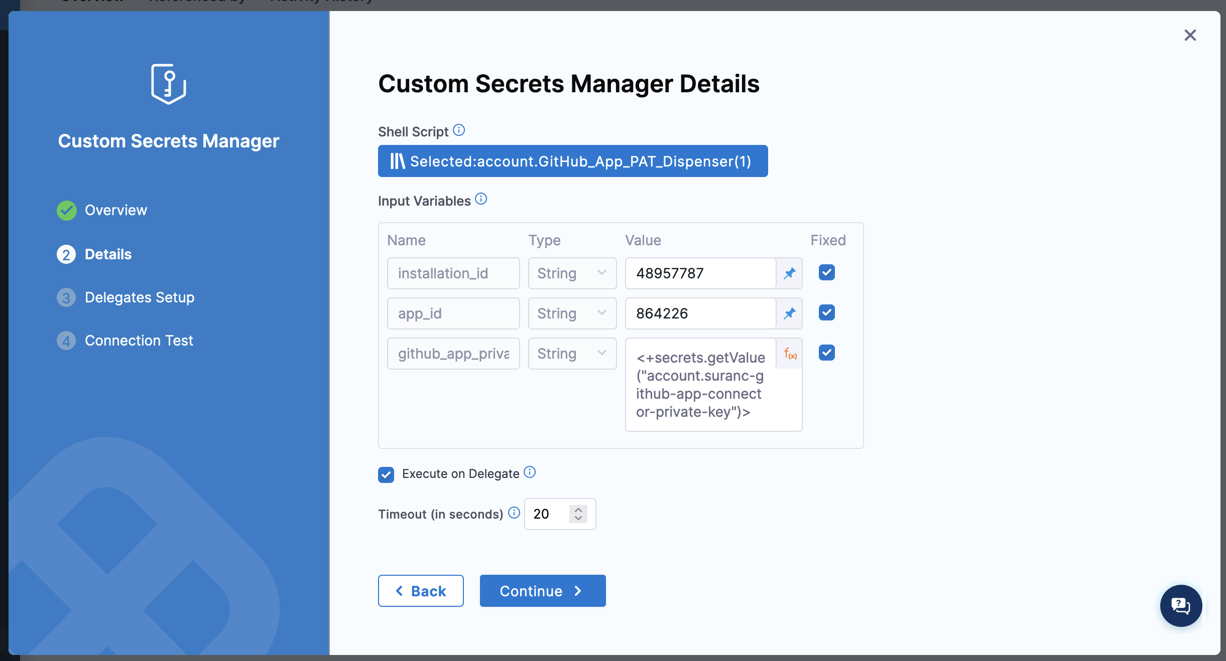 installation_id- GitHub App installation IDapp_id- GitHub App IDgithub_app_private_key- An expressions referencing a Harness file secret containing the GitHub App's private key.