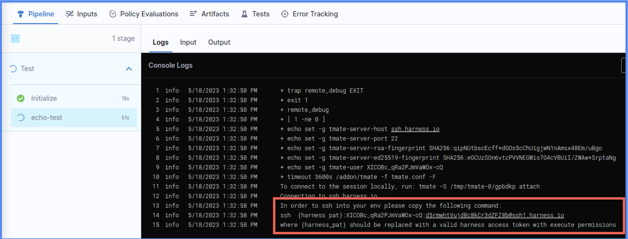 {harness pat}with your token that haspipeline executionpermissions.ssh {harness pat}:<your-harness-account-ID>:<random-session-token>@tmate.harness.io