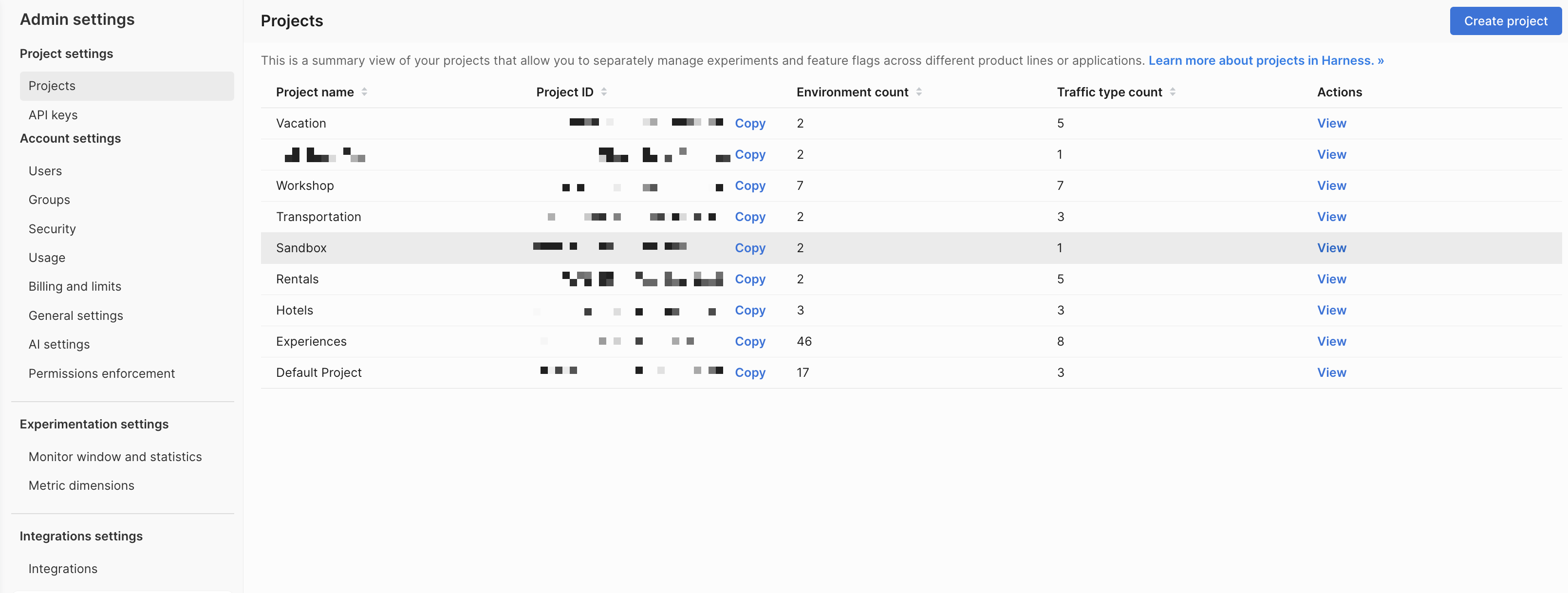 2. Click View under the Actions column for the project you want to create an SDK API key in.