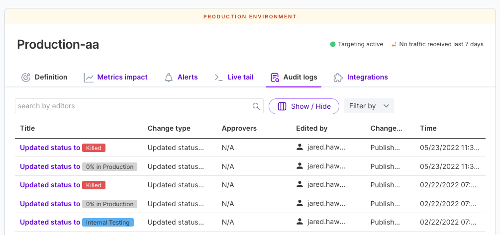 To find audit log entries, click the Audit logs tab when viewing a feature flag, segment, or metric.