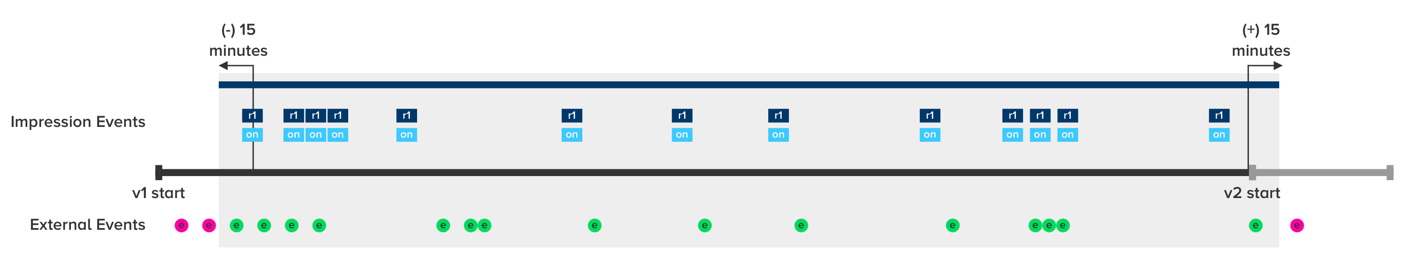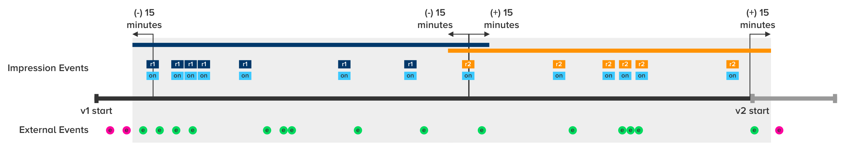 In this case, Harness FME isolates the events and applies a 15-minute buffer to the first and last impression received for the unique rule and treatment combination. Specifically, 30 minutes are centered around the latter treatment assignment where events are attributed to both targeting rules and treatments.