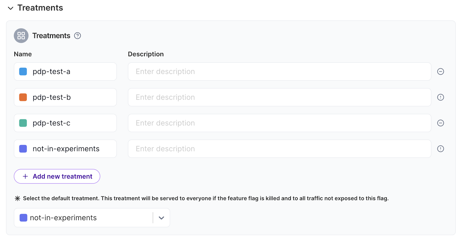 We create a parent feature flag named pdp_test_parent with four treatments, one for each of the experiments, as well as a not-in-experiments treatment. In this example, we use a percentage-based targeting rule to divide traffic, but you could also use attribute-based targeting rules.
