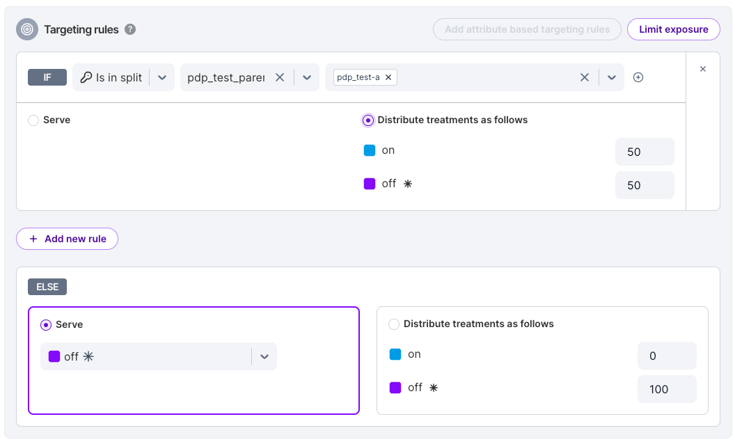 Select Distribute treatments as follows and allocate user traffic percentages to this dependent flag’s treatments. For fastest experimental results, you can set on to 50% and off to 50% (or you may enter a smaller percentage for on, to begin a gradual rollout of the php-test-a feature).